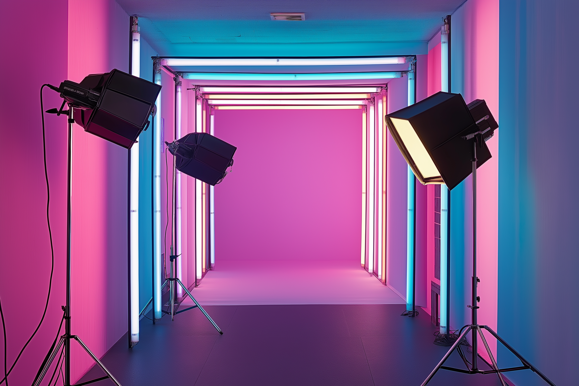 The image captures a vibrant and photorealistic portrayal of Las Vegas, illuminated by pink and purple neon lights. The dynamic colors create an energetic atmosphere, inviting viewers to experience the excitement of the city.