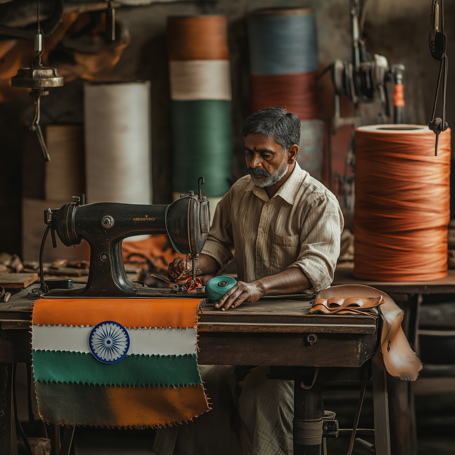 The image captures a busy leather factory with an industrious feel, showcasing stacks of leather rolls and various sewing tools. A tailor is focused on his craft, embodying the rustic charm of traditional leatherworking.
