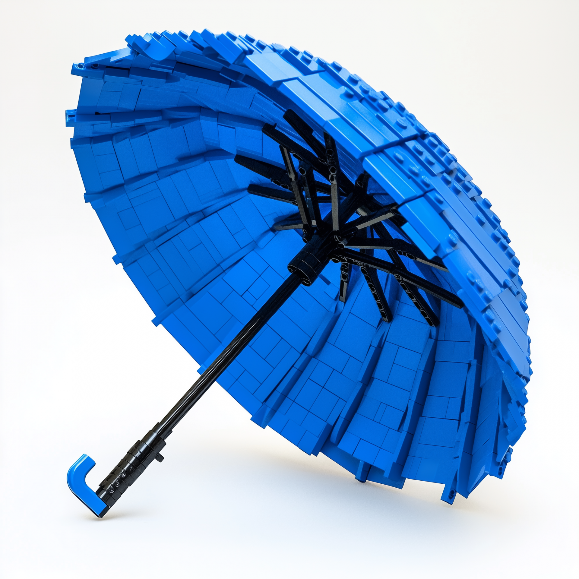 This image showcases a vibrant blue umbrella made entirely of Lego bricks, lying open on a flat surface. The backdrop is a clean white, enhancing the intricate details of the Lego structure in a realistic photo style.