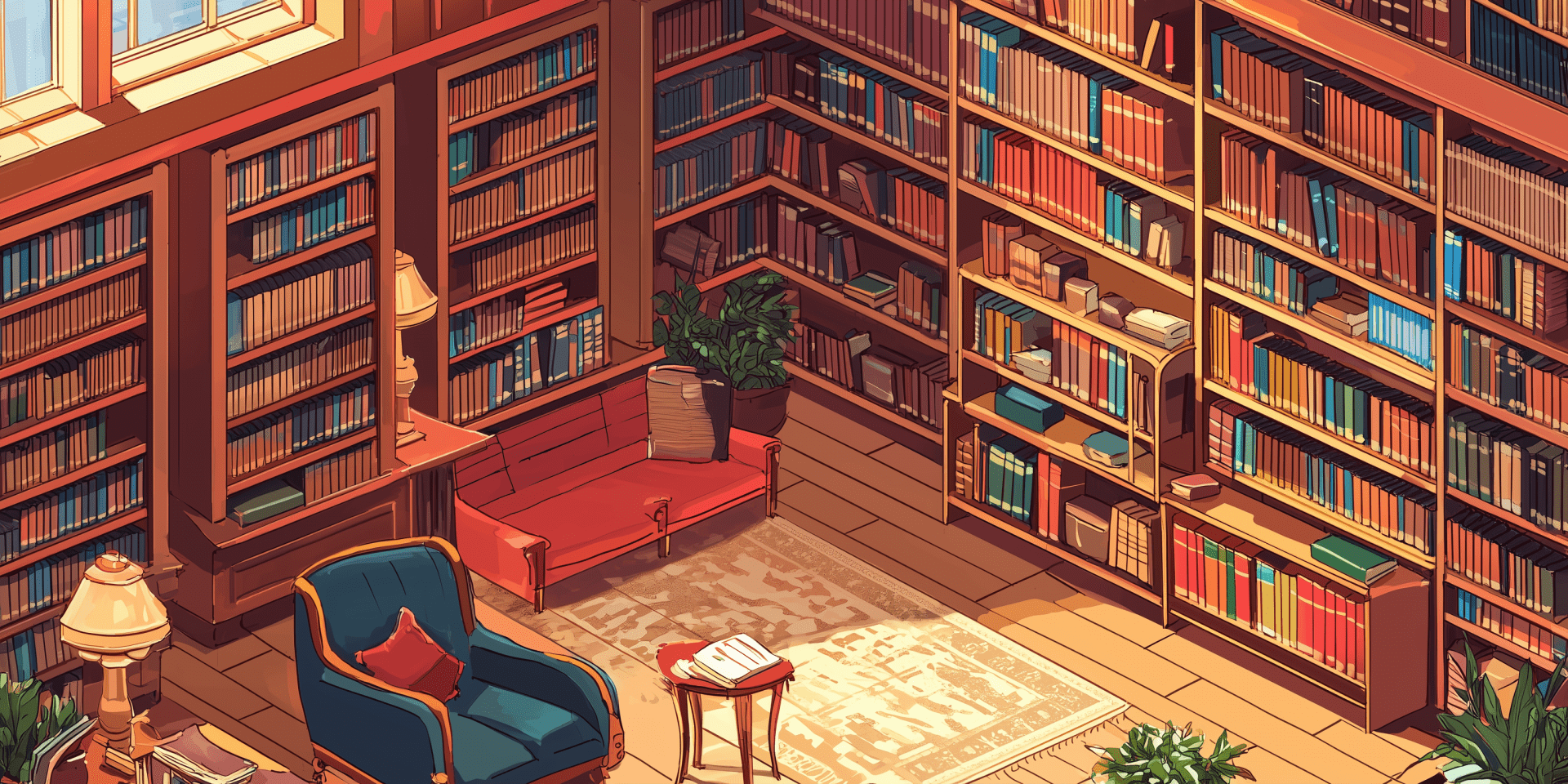 This image depicts an isometric view of a library, rendered in a vibrant comic style. The scene is rich in detail, showcasing shelves filled with books and various cozy reading areas.