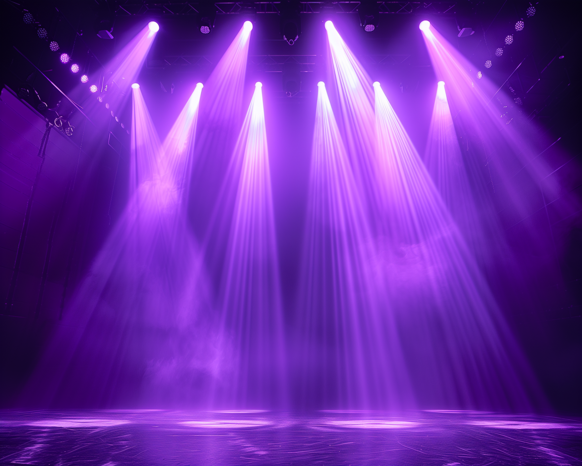 The image captures a vibrant stage illuminated by dramatic purple spotlights. The atmosphere is electric, filled with a sense of excitement as the lights enhance the visual spectacle.