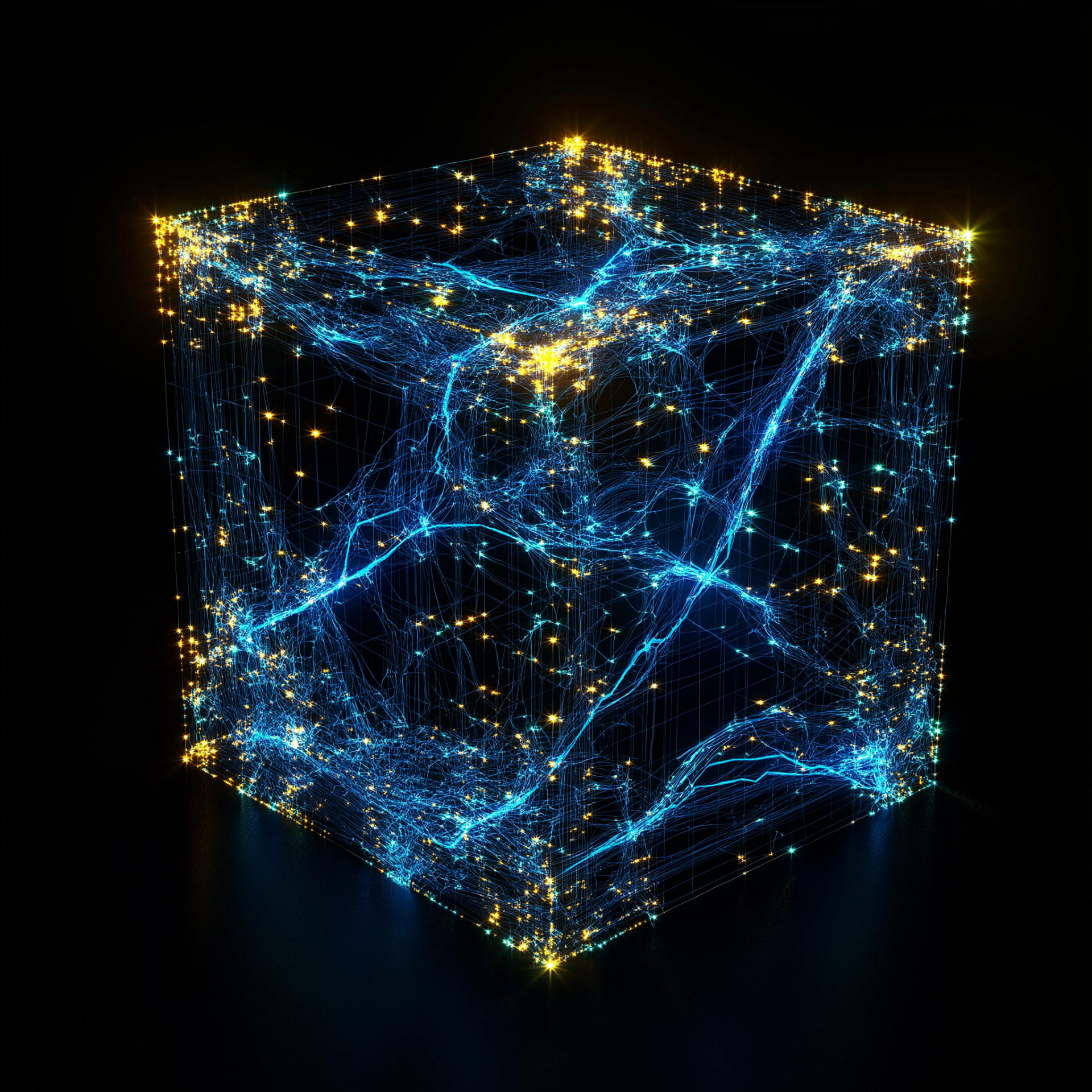 The image features a striking 4D wireframe cube composed of vibrant blue and yellow lightning. Set against a deep black background, the cube appears dynamic and electrifying, creating a sense of depth and energy.