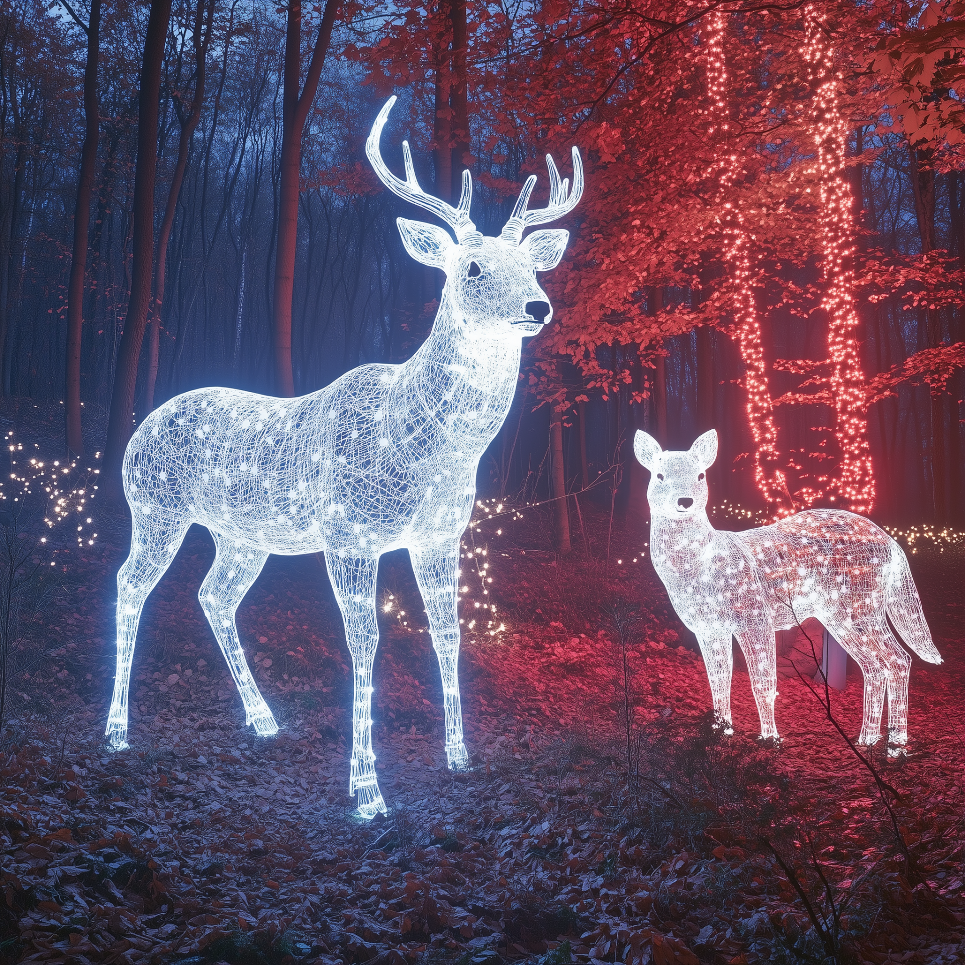 The image captures a mesmerizing light art installation set in a forest at dusk, surrounded by trees with vibrant red leaves. Illuminated sculptures of a white deer and a fox create a dreamlike atmosphere, complemented by a striking sika deer standing gracefully to the side.