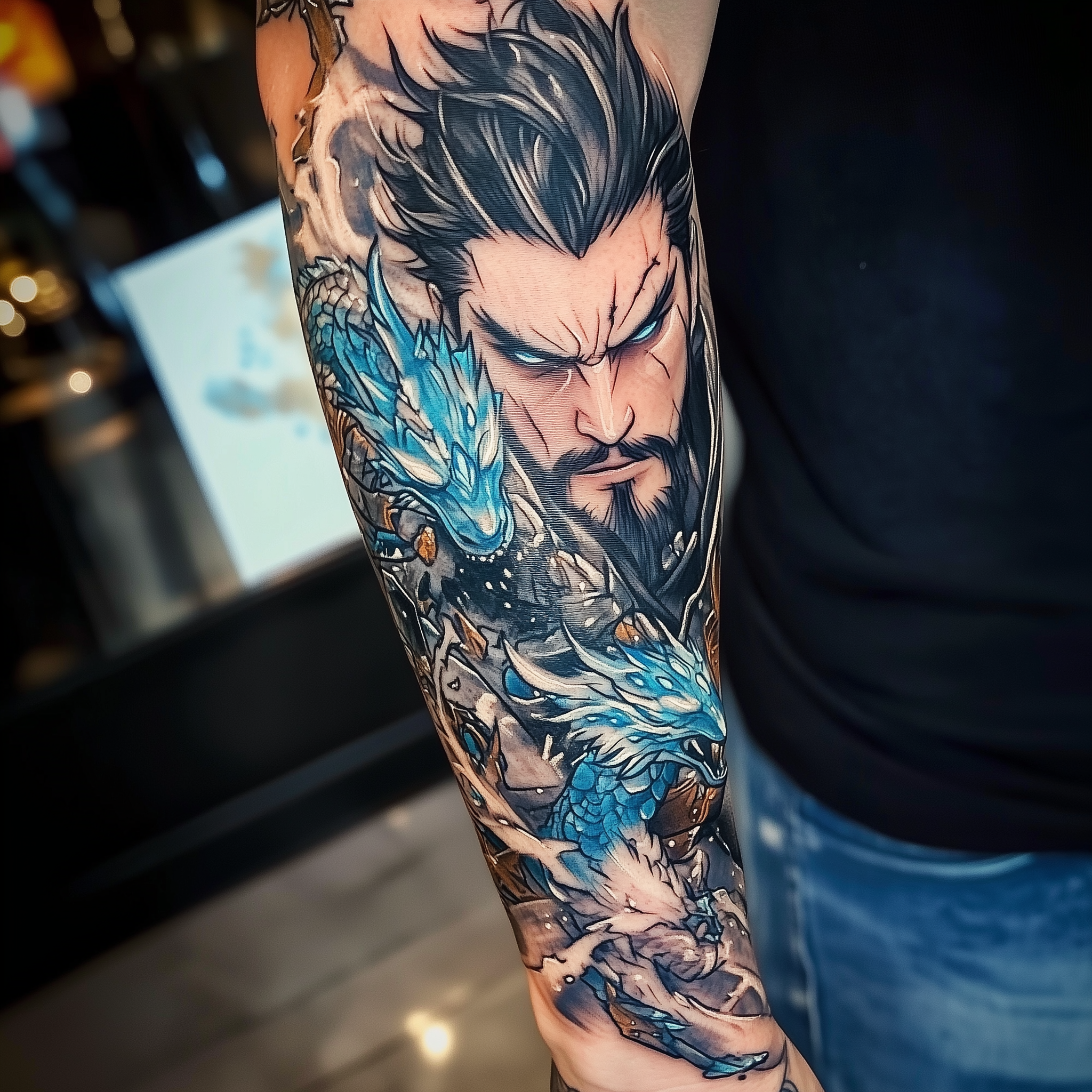 A photorealistic tattoo covering the entire forearm of a Caucasian person, featuring Hanzo from Overwatch using his ultimate ability with two giant spirit dragons and blue snowflake crystals.