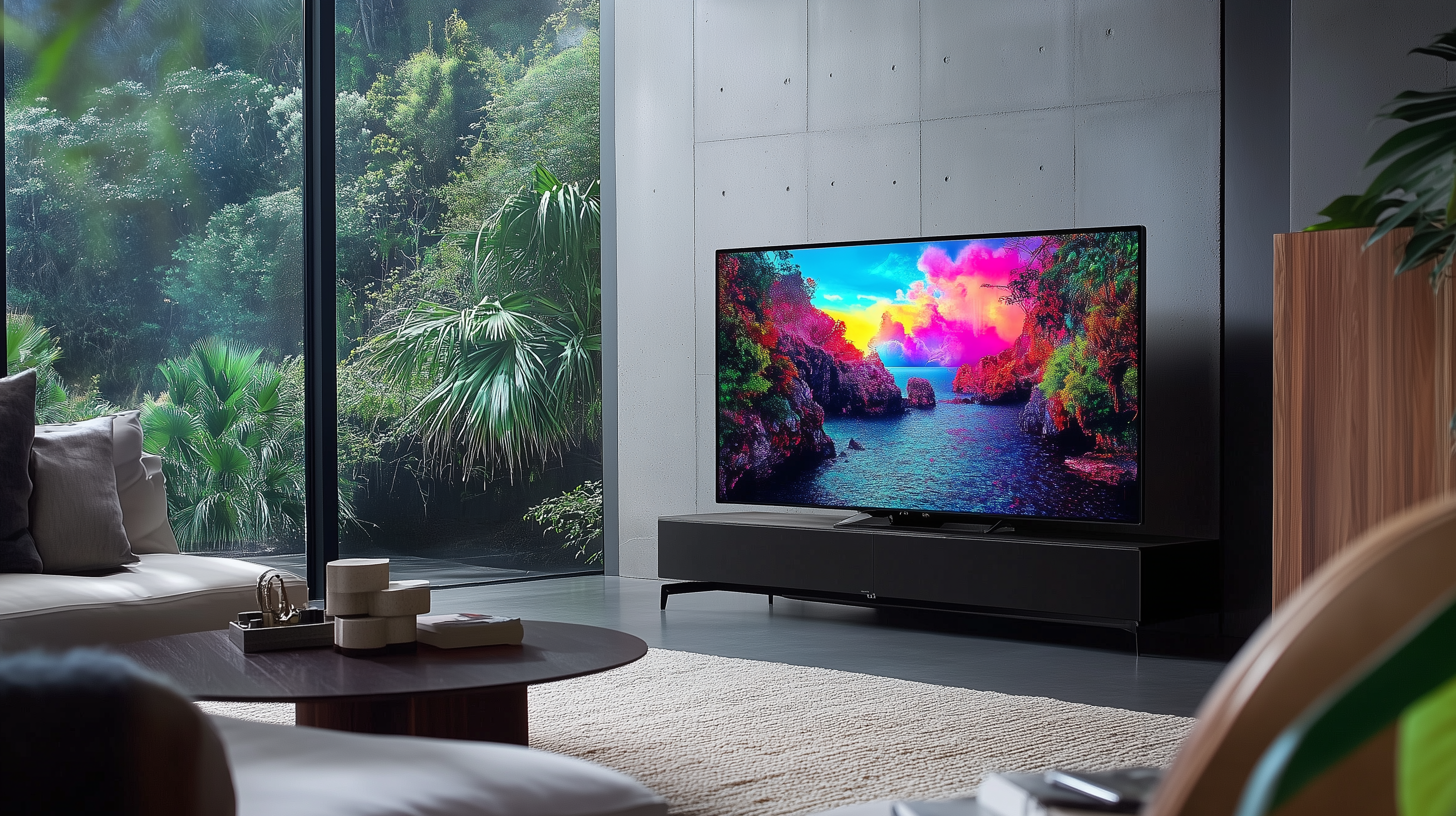 A vibrant and colorful image displayed on a large TV screen, filling the room with lively hues and brightness.