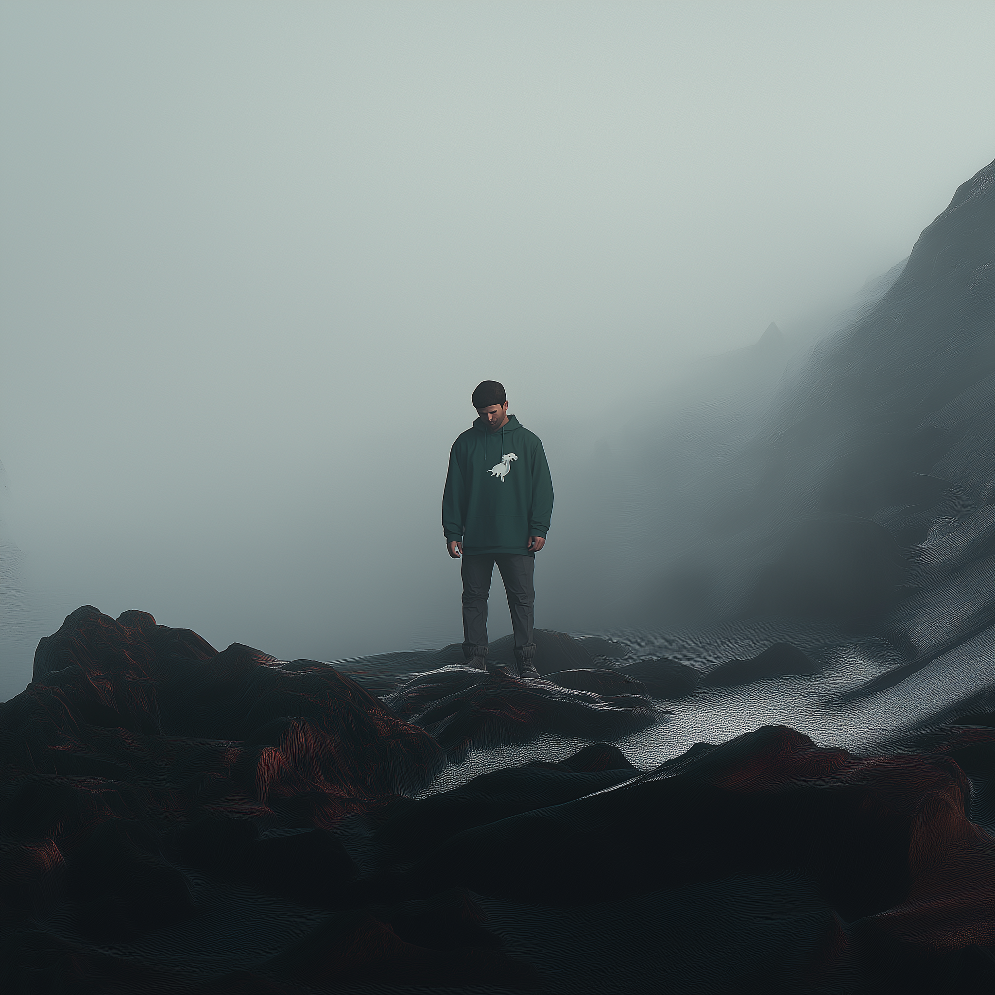 This illustration features a solitary man wearing a t-shirt, gazing at a fog-covered landscape filled with mountains and ocean. The overall atmosphere conveys a sense of sadness and solitude, evoking deep emotions amidst the natural beauty.
