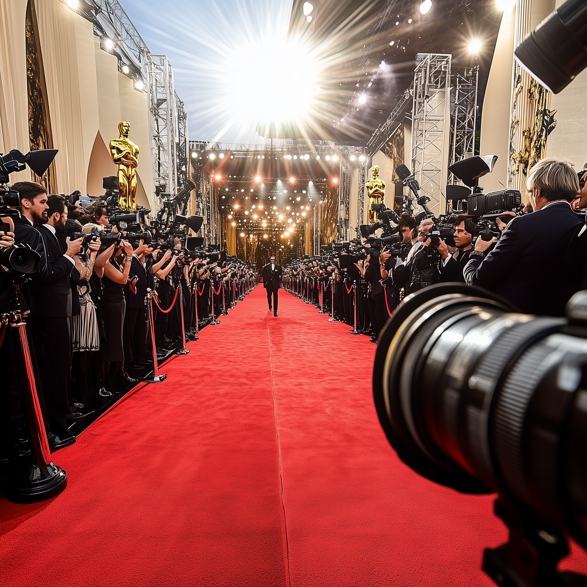 The image captures the glamour and excitement of the Oscars red carpet, with a vibrant scene set in Los Angeles. Paparazzi cameras surround the frame, suggesting an atmosphere filled with anticipation and energy as camera flashes light up the area.