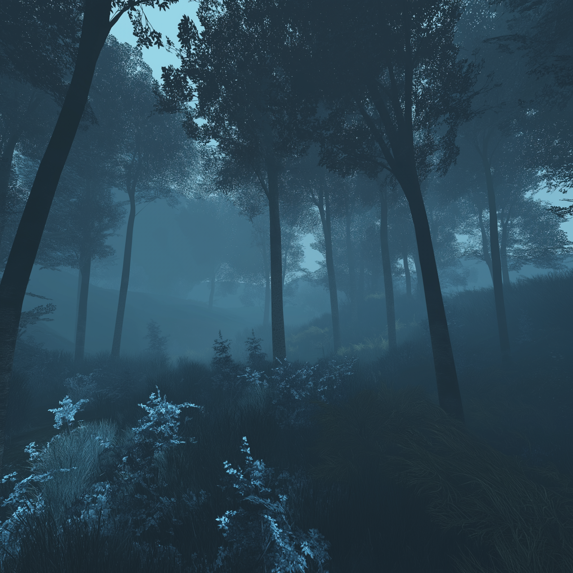 This image captures a haunting yet beautiful overgrown forest at night. The tall trees rise majestically, shrouded in mist and fog, creating an atmosphere that feels both eerie and captivating.