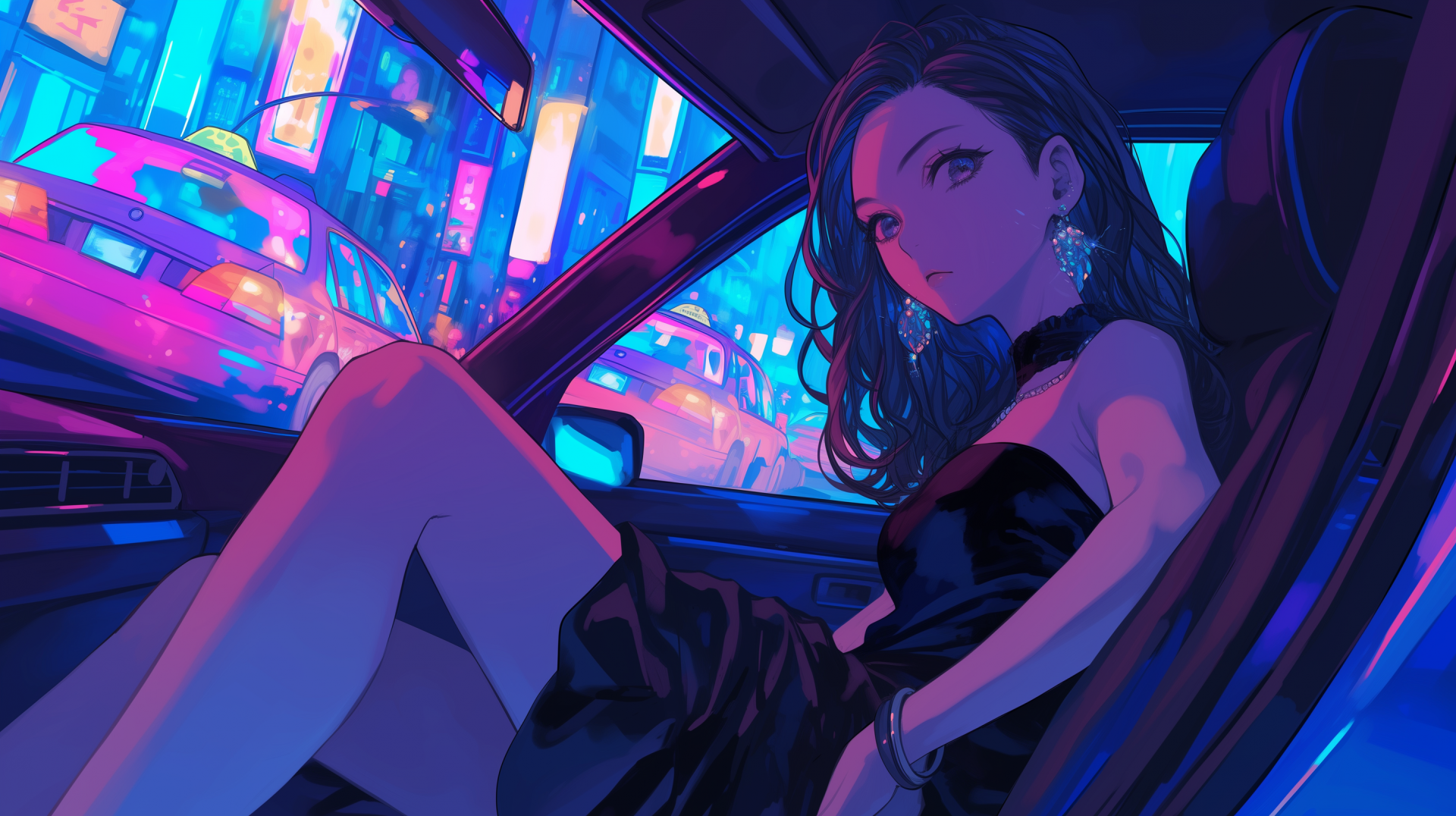The image features a beautiful Japanese woman sitting gracefully in the back seat of a cab, showcasing an anime-inspired art style. The scene captures a serene moment, with soft lighting highlighting her features and the cozy interior of the cab.