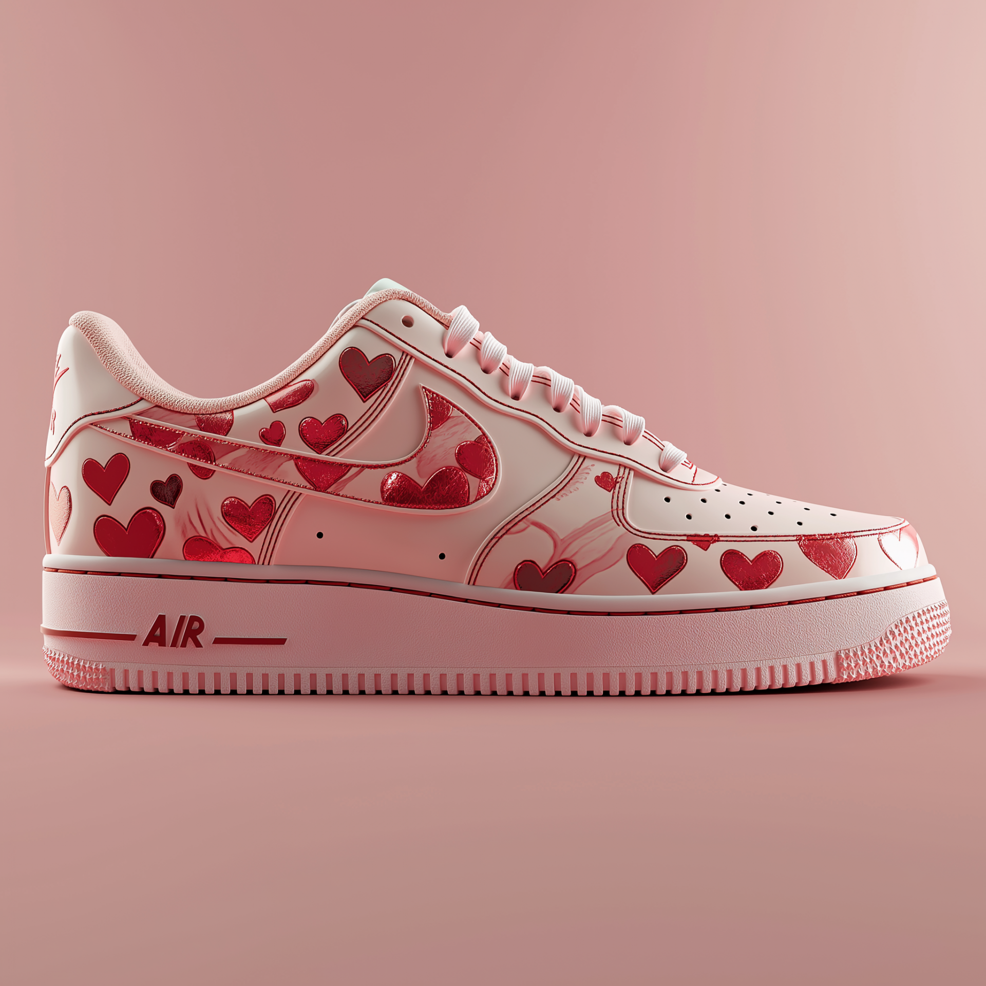 This illustration features a stunning custom-designed Air Force One shoe that is inspired by Valentine's Day. The shoe showcases vibrant hearts and roses, all beautifully set against a contrasting vintage 1970s Valentine's Day background, creating a hyper-realistic and romantic feel.