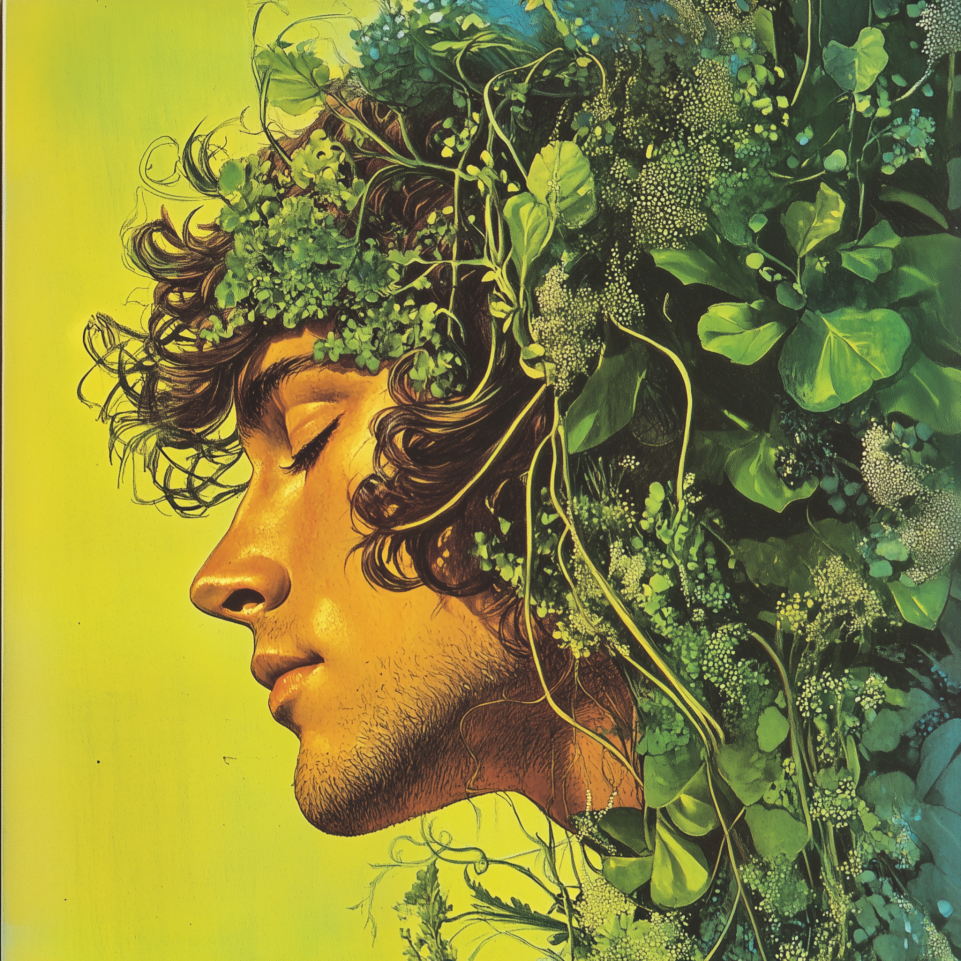 This illustration features a vibrant and whimsical depiction of a gay male romance set in a sci-fi world. A sentient plant interacts with the two male characters, capturing the essence of love across the boundaries of nature and humanity.