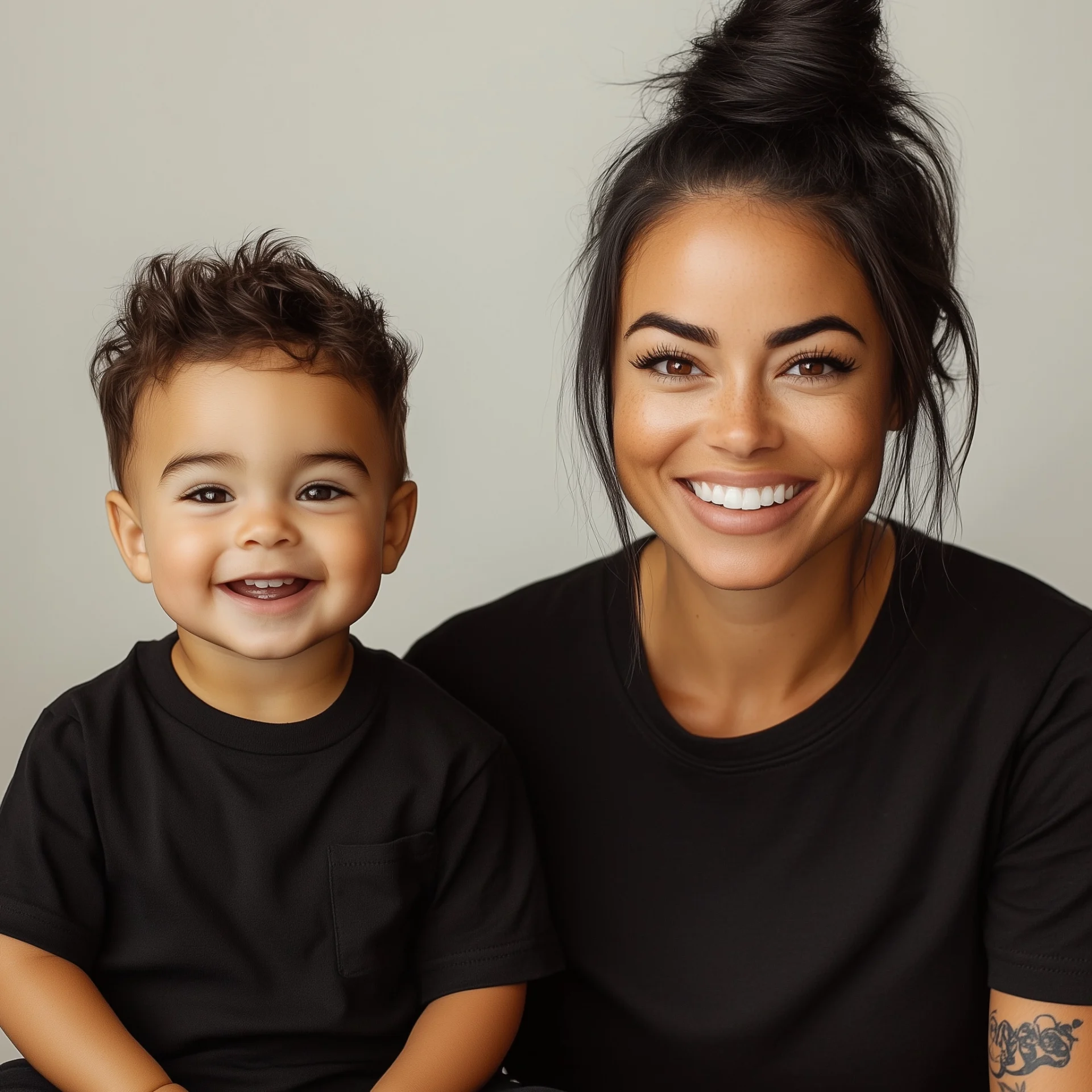 This image captures a warm golden hour scene from above, showcasing the charming shadow of a mother and son creating a heart shape on the ground. Surrounding them is a vibrant field of flowers, adding a serene and loving atmosphere to the moment.
