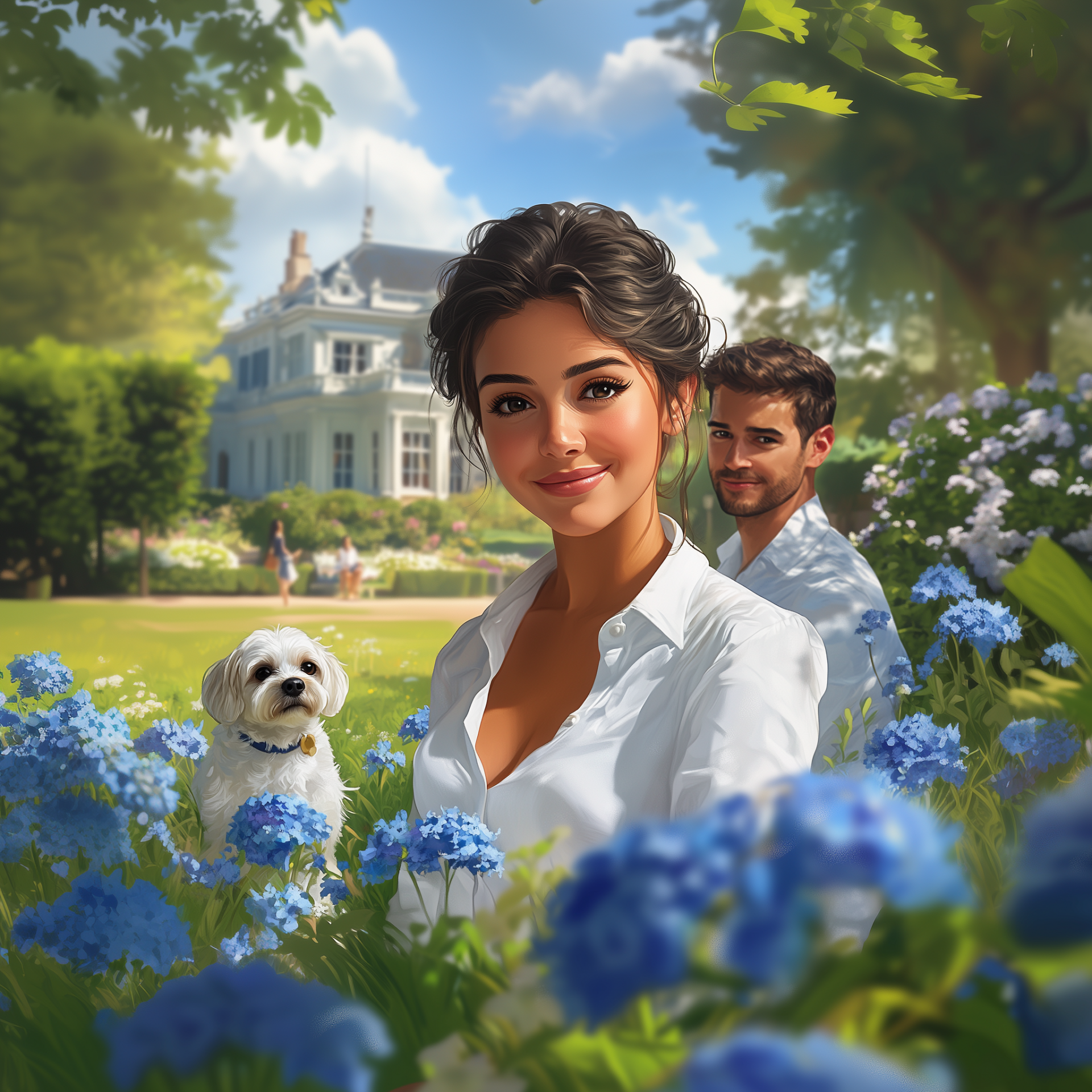 This photorealistic image captures a joyful moment in a vibrant garden filled with blue and white flowers. A couple sits happily in the foreground, surrounded by lush greenery and a charming English house in the background.