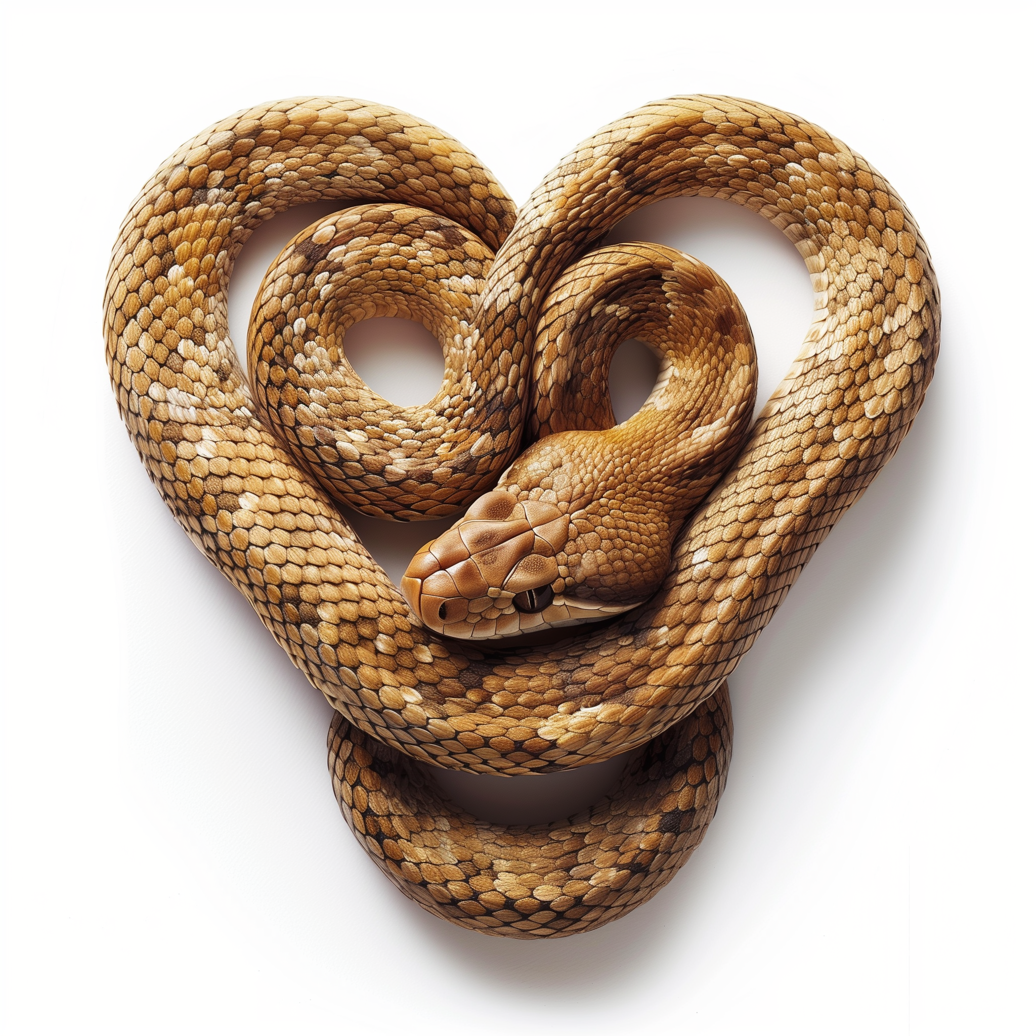The image features a snake coiled in a heart shape, creating a striking and symbolic representation of love and nature. It is presented against a clean white background, enhancing the visual impact of the design.
