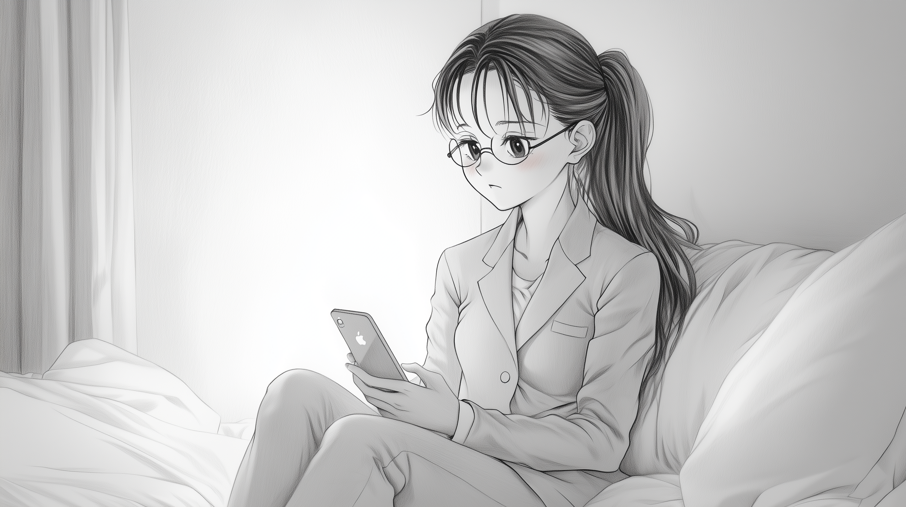 A masterpiece pencil drawing on white paper featuring correct anatomy, set in a dimly lit room. The focus is on a single iPhone in Suzu Hirose's room, capturing an extreme close-up shot.