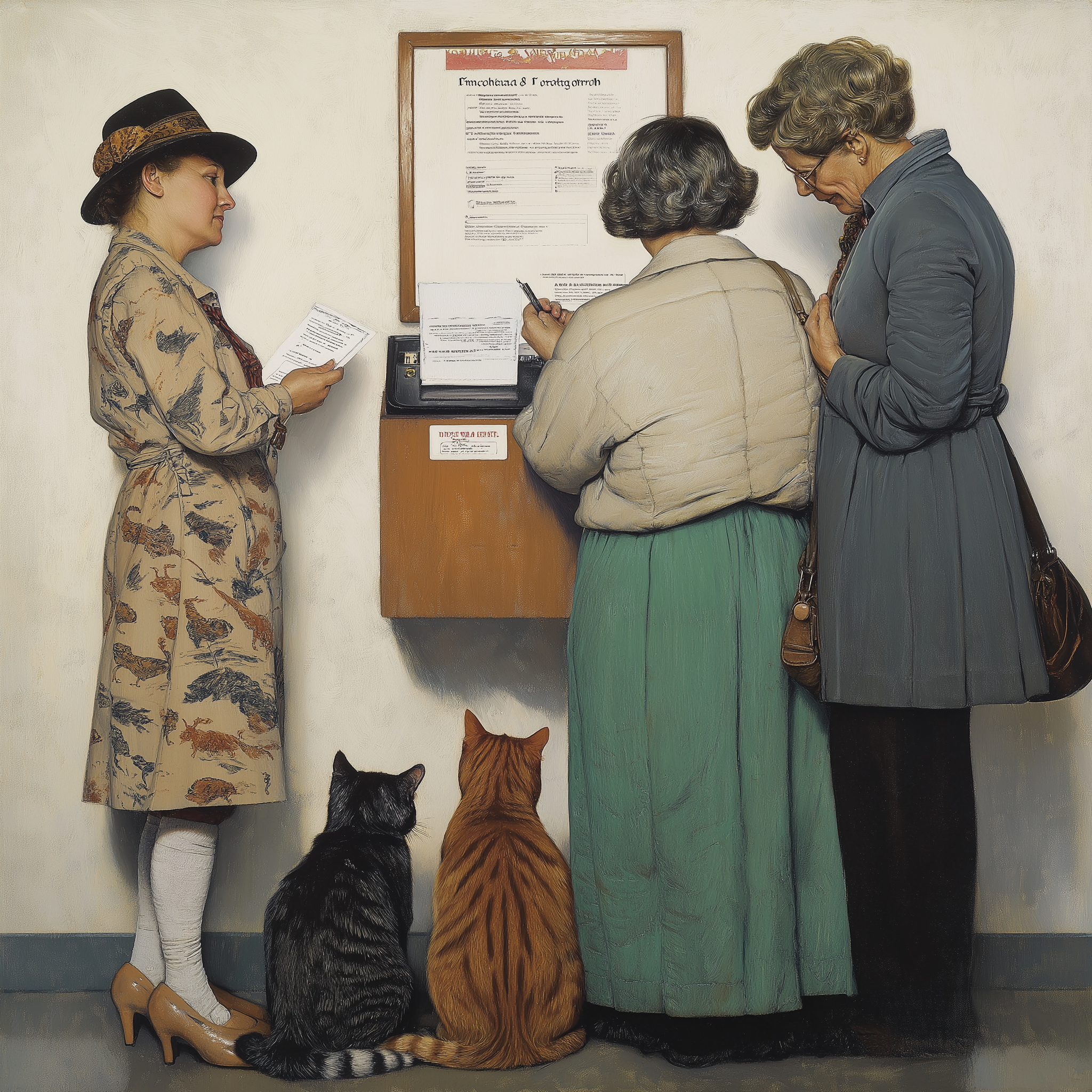An illustration depicting a woman accompanied by three cats, patiently waiting to register and vote in the year 2024. The scene captures a nostalgic and patriotic vibe, symbolizing civic duty and democratic participation.
