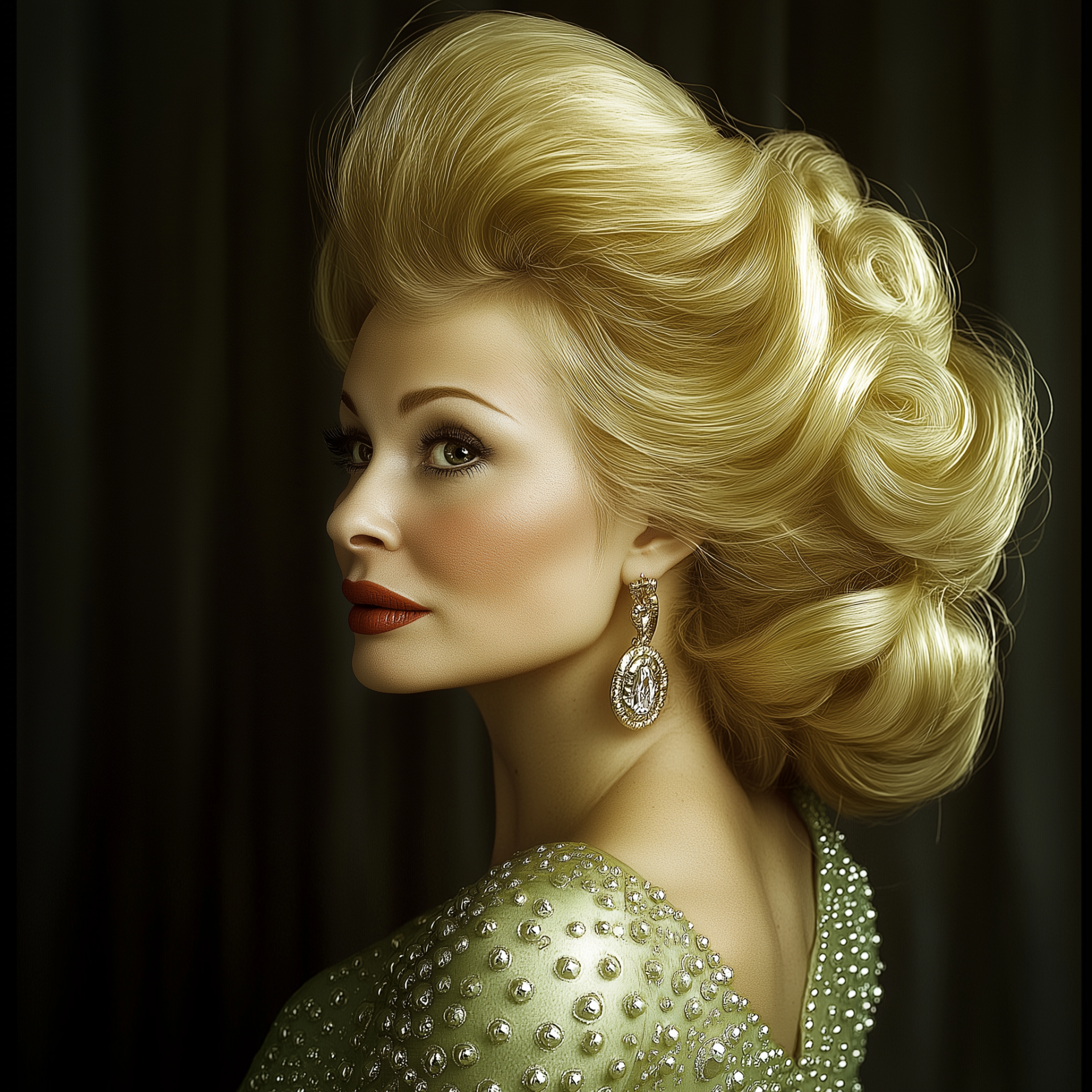 This photo realistic image captures a lady with intricate details bathed in bright studio lighting. The style evokes a sense of the 60s, reminiscent of artistic photography seen in magazines.
