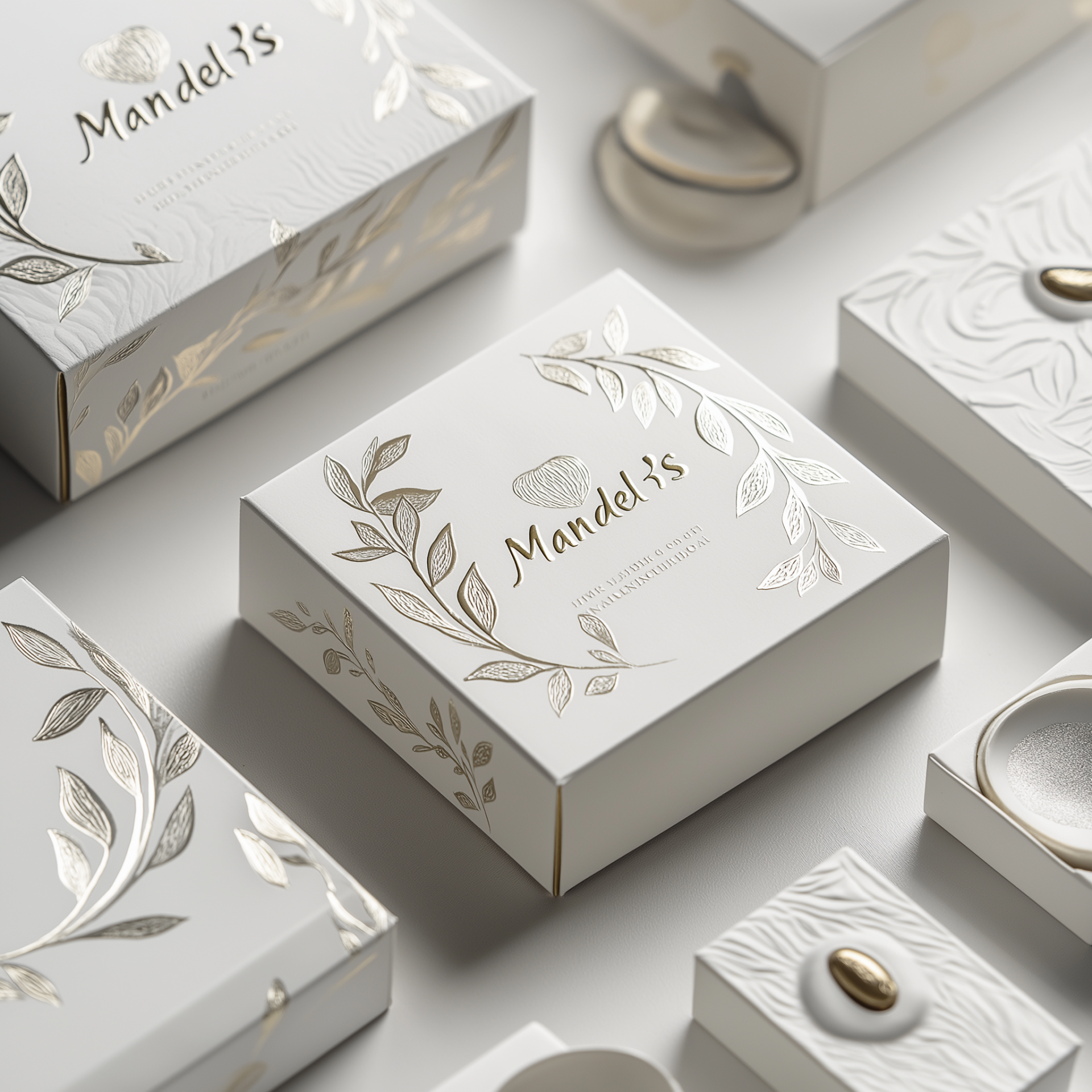 This image showcases a luxurious branding suite designed for an artisanal brand. The aesthetic is elegant and sophisticated, featuring refined colors and textures that evoke a sense of quality and craftsmanship.