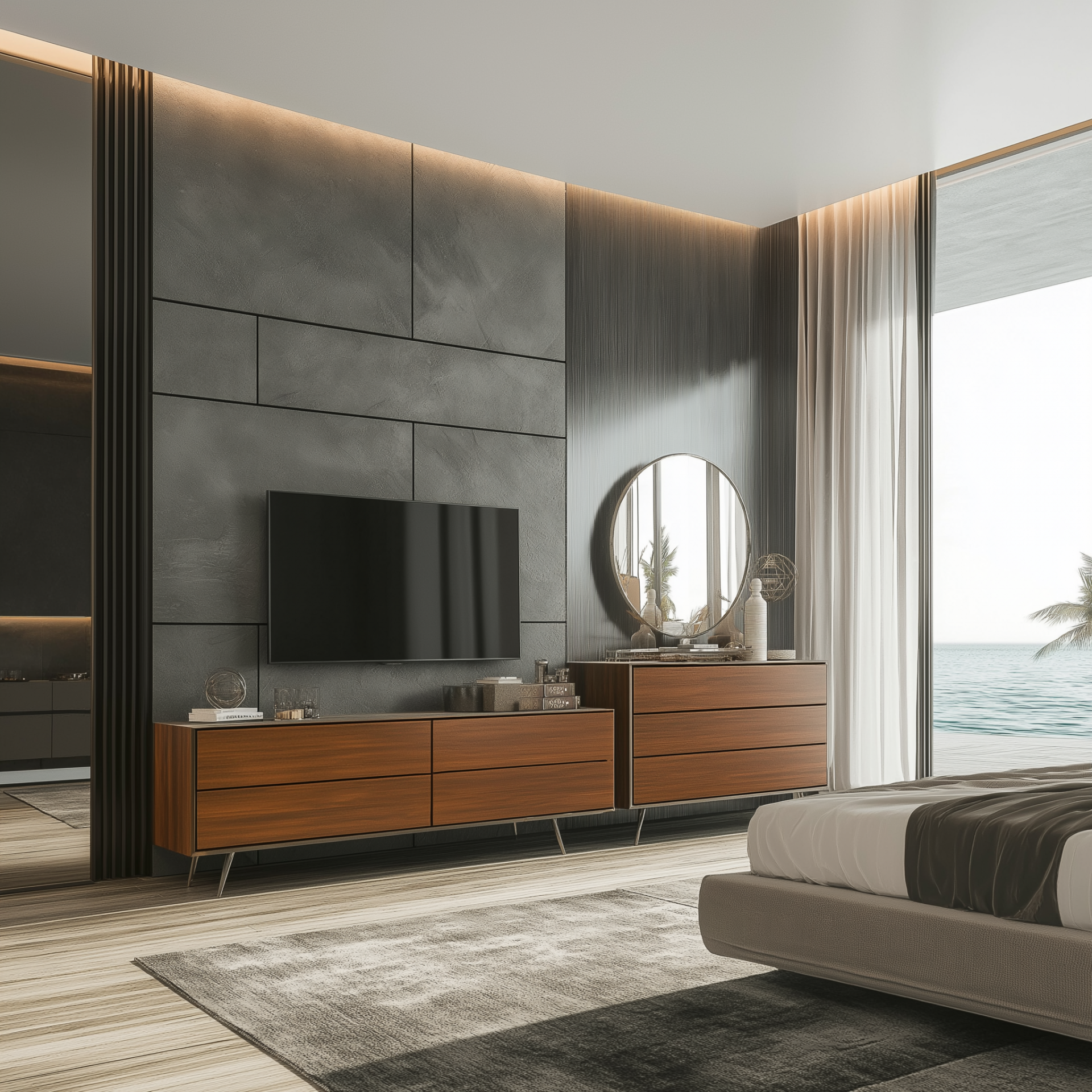 This image showcases a luxury modern master bedroom featuring a sleek design and elegant furnishings. The room has stunning sea views from the sixth floor, complemented by ambient pendant lighting and high-quality materials.