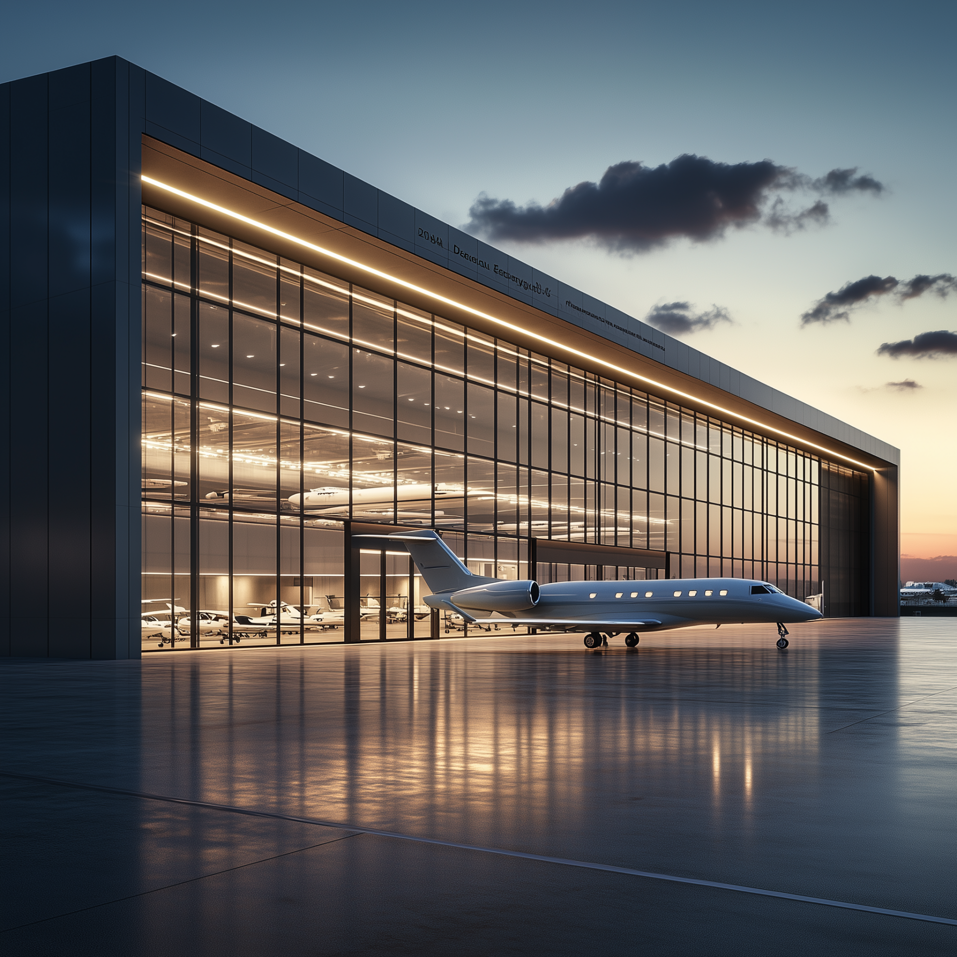 The image showcases a very large modern airport hangar with a luxurious design. Its impressive architecture features sleek lines and incorporates large glass windows that provide a view of the jets inside and the lavish interiors.