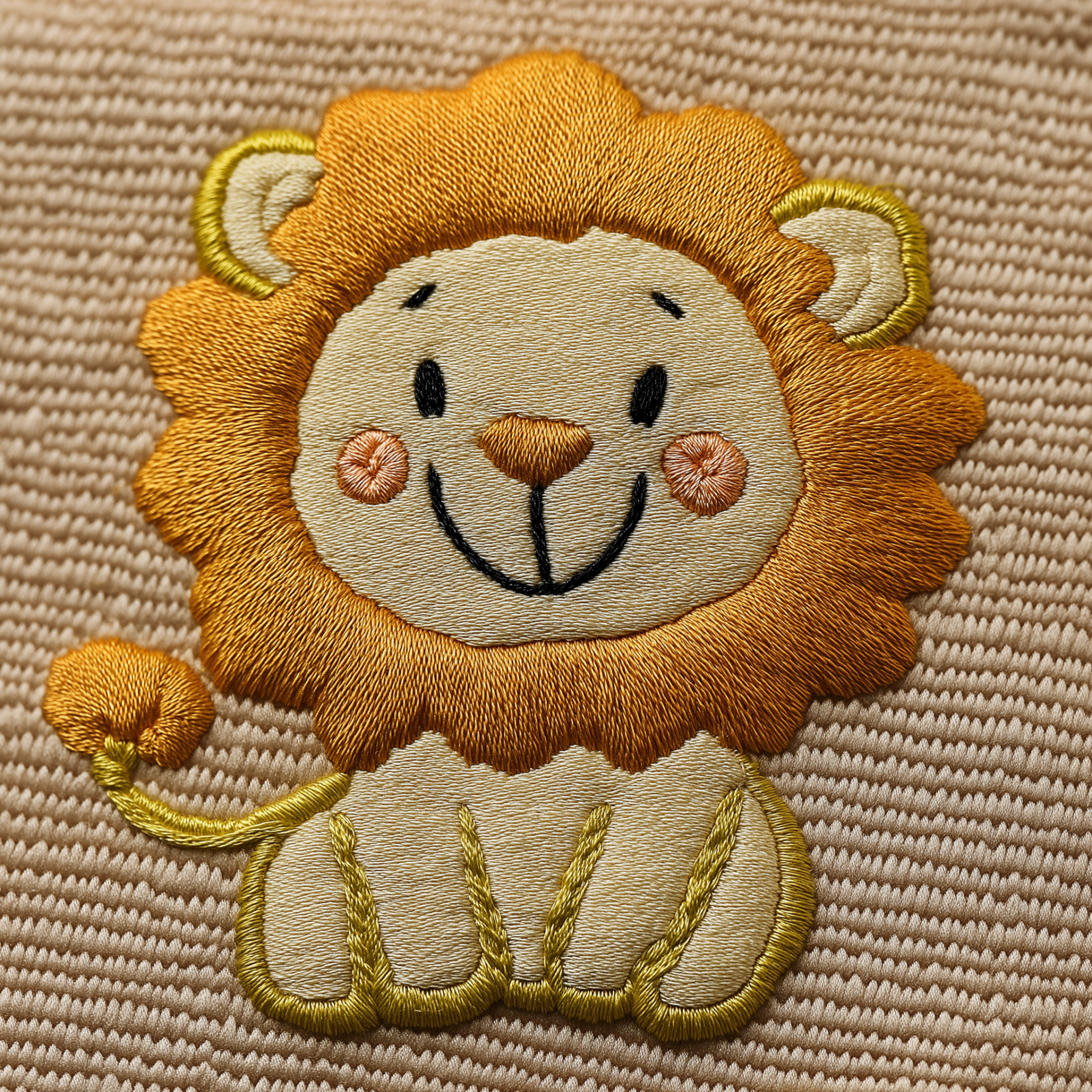 This illustration features a charming and playful lion, beautifully designed with intricate embroidery patterns. The overall style exudes a sense of luxury while appealing to a youthful audience.