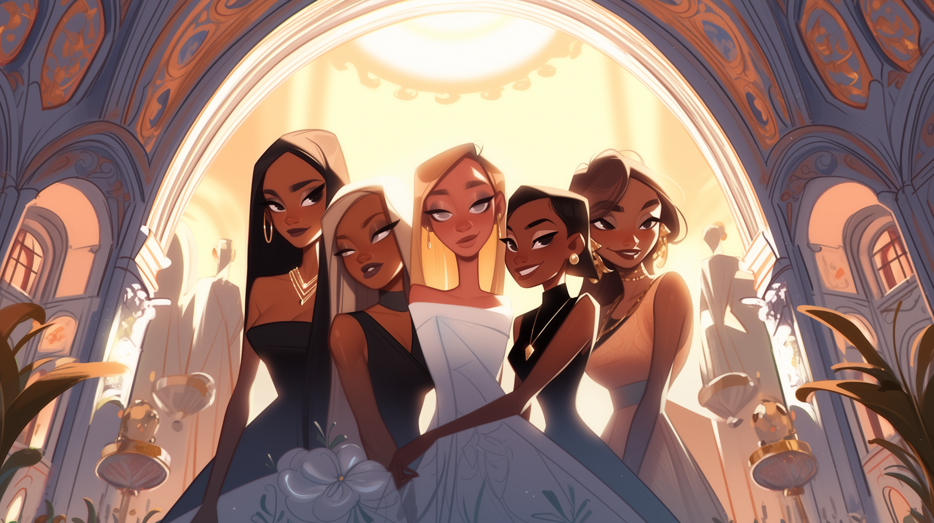 The image showcases a lively gathering of elegantly dressed women enjoying a festive atmosphere in a grand chateau. It combines vibrant colors and a unique blend of realism with cartoon elements, conveying a luxurious and bold lifestyle.
