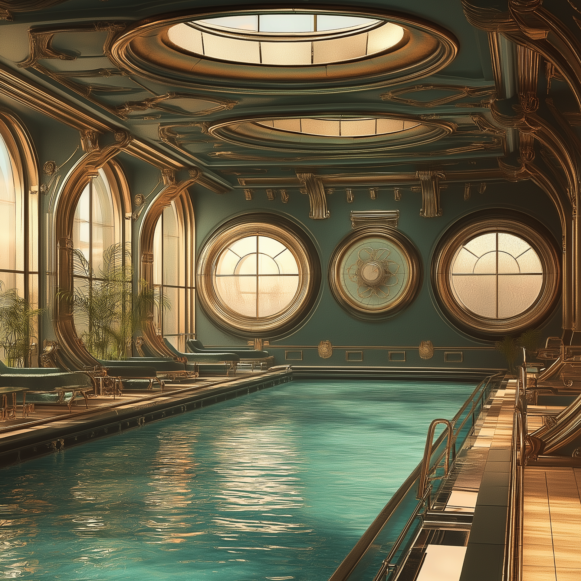 The image showcases a glamorous scene of people enjoying a swim in a retro-futuristic swimming pool. The breathtaking interior of a gigantic luxurious passenger ship creates a unique and opulent atmosphere.