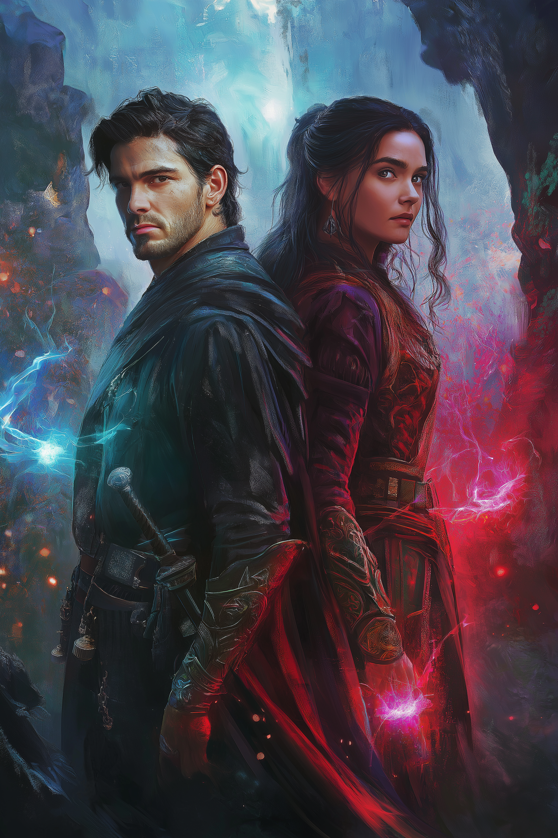 The image showcases a captivating fantasy scene featuring a handsome sorcerer alongside his enchanting partner, both exuding magical energy. The background is filled with mystical landscapes, including ancient ruins, towering mountains, and glowing caves that create a sense of otherworldly wonder.