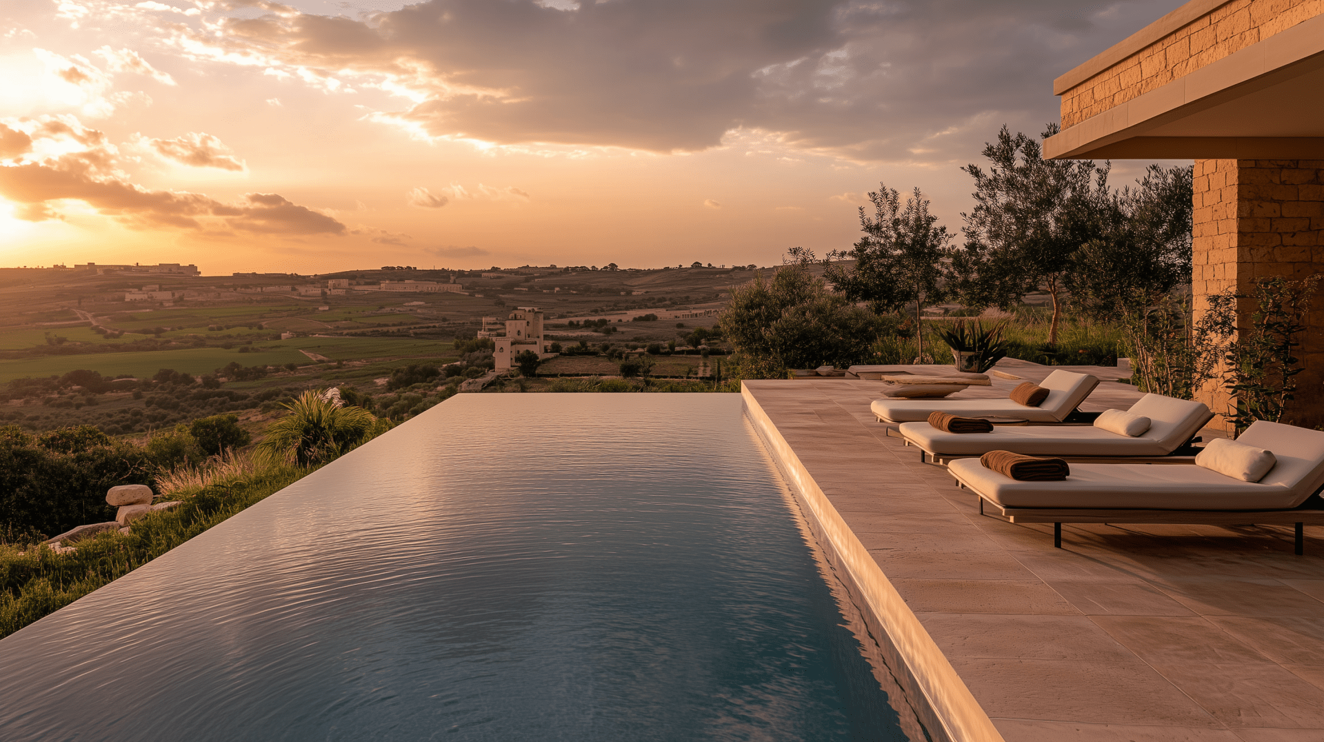 The image captures a serene evening scene of a modern farmhouse pool area bathed in soft twilight. It overlooks a picturesque valley and fields, creating a peaceful atmosphere that combines rustic charm with contemporary design.