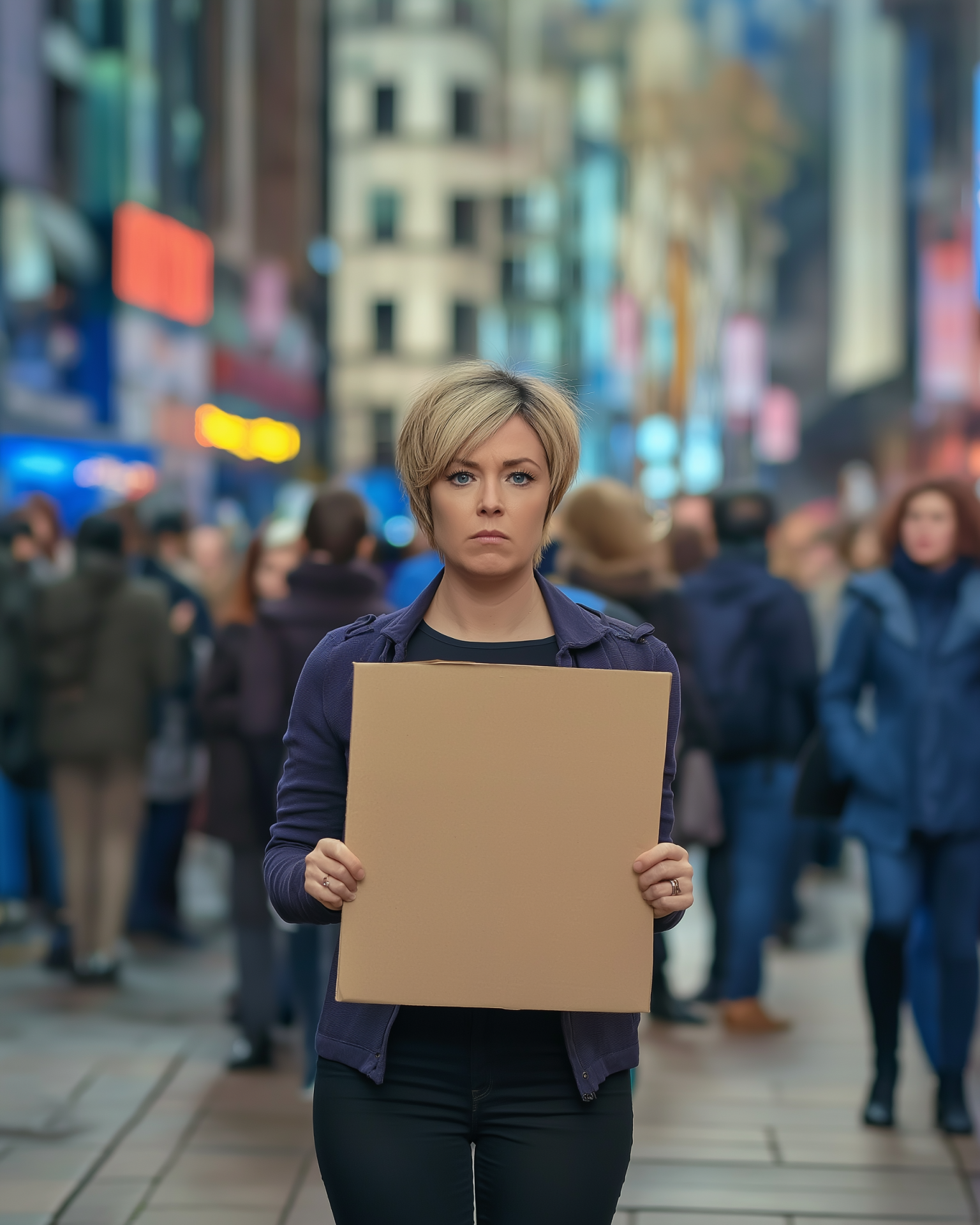 A woman with a short, asymmetrical pixie bob stands confidently in a bustling Manchester street. Her voluminous layered haircut and stern expression convey a strong presence amidst the crowd.