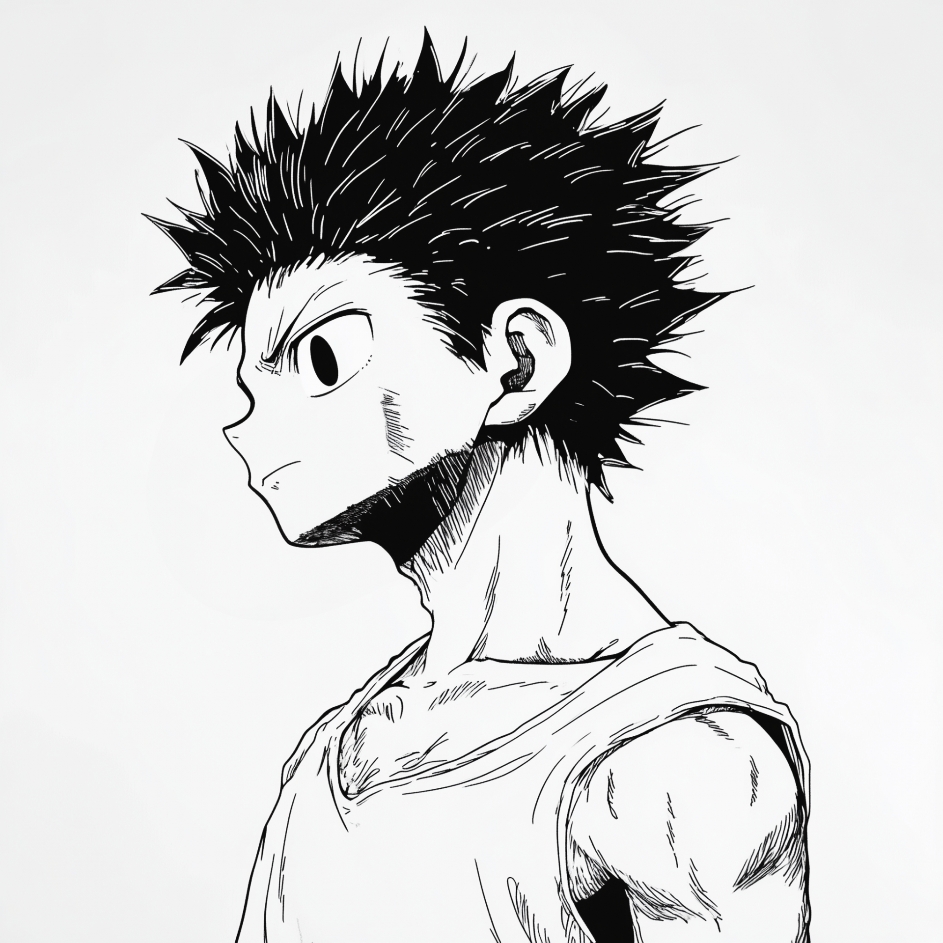 The image features a front profile of an older male manga character with a strong, lean physique. He has spiky black messy hair and light facial hair, illustrated in black and white line art style.