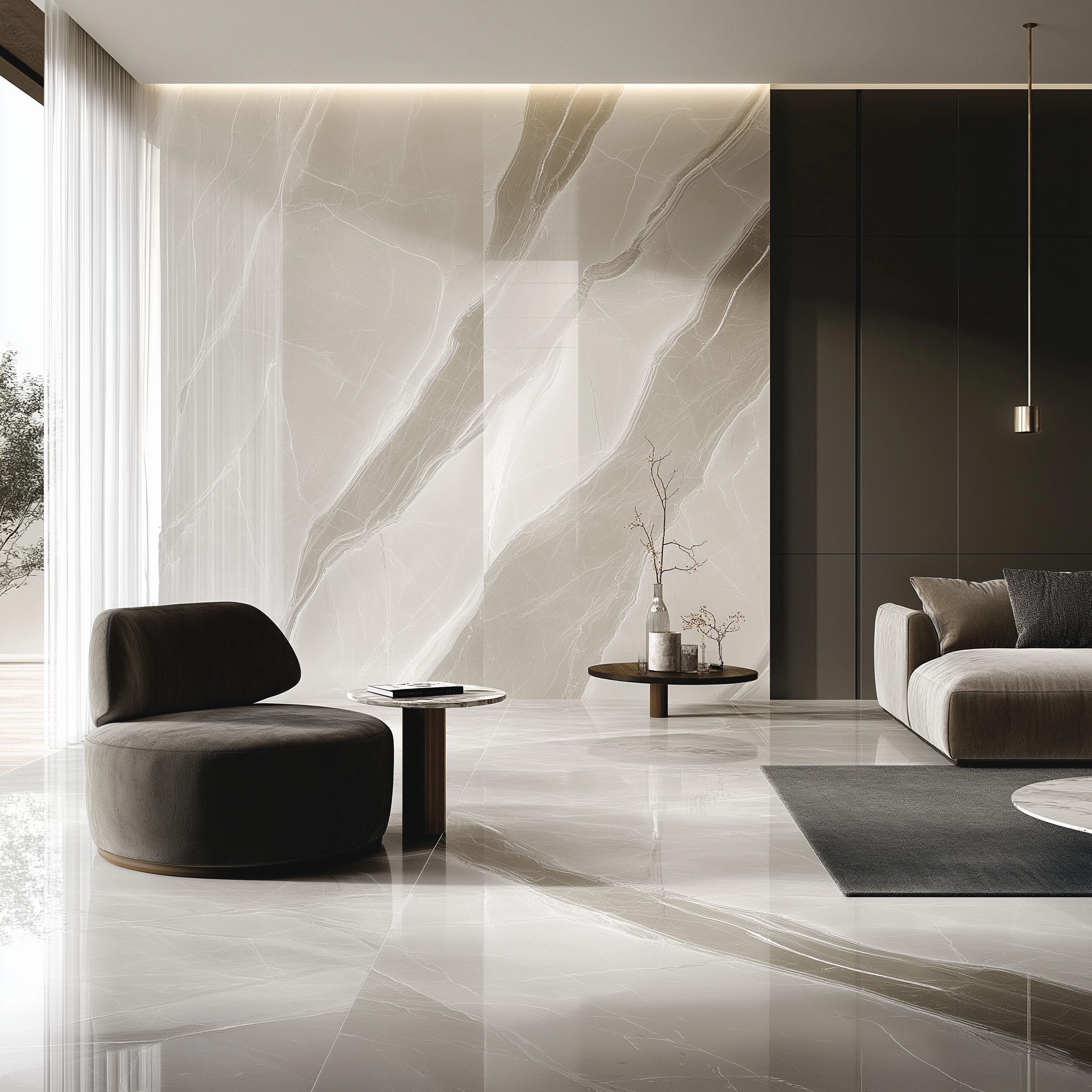 The image showcases a smooth and elegant marble surface featuring soft gray and white veins. Natural lighting enhances the minimalist and clean aesthetic, presenting a sense of luxury.
