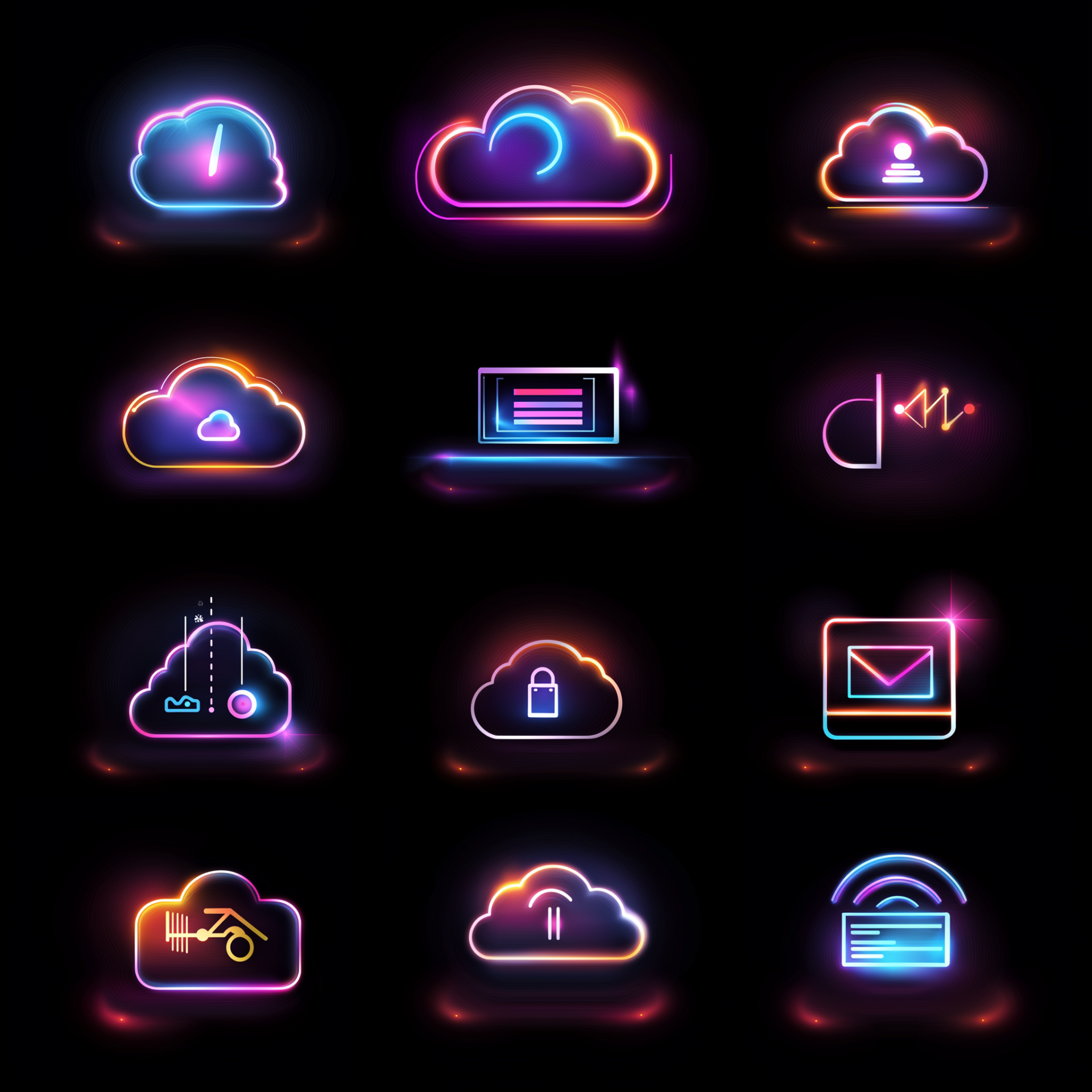 This image features a vibrant set of emoji icons representing cloud computing and artificial intelligence. The high contrast and bright colors make the icons visually striking, perfect for engaging users in a digital environment.