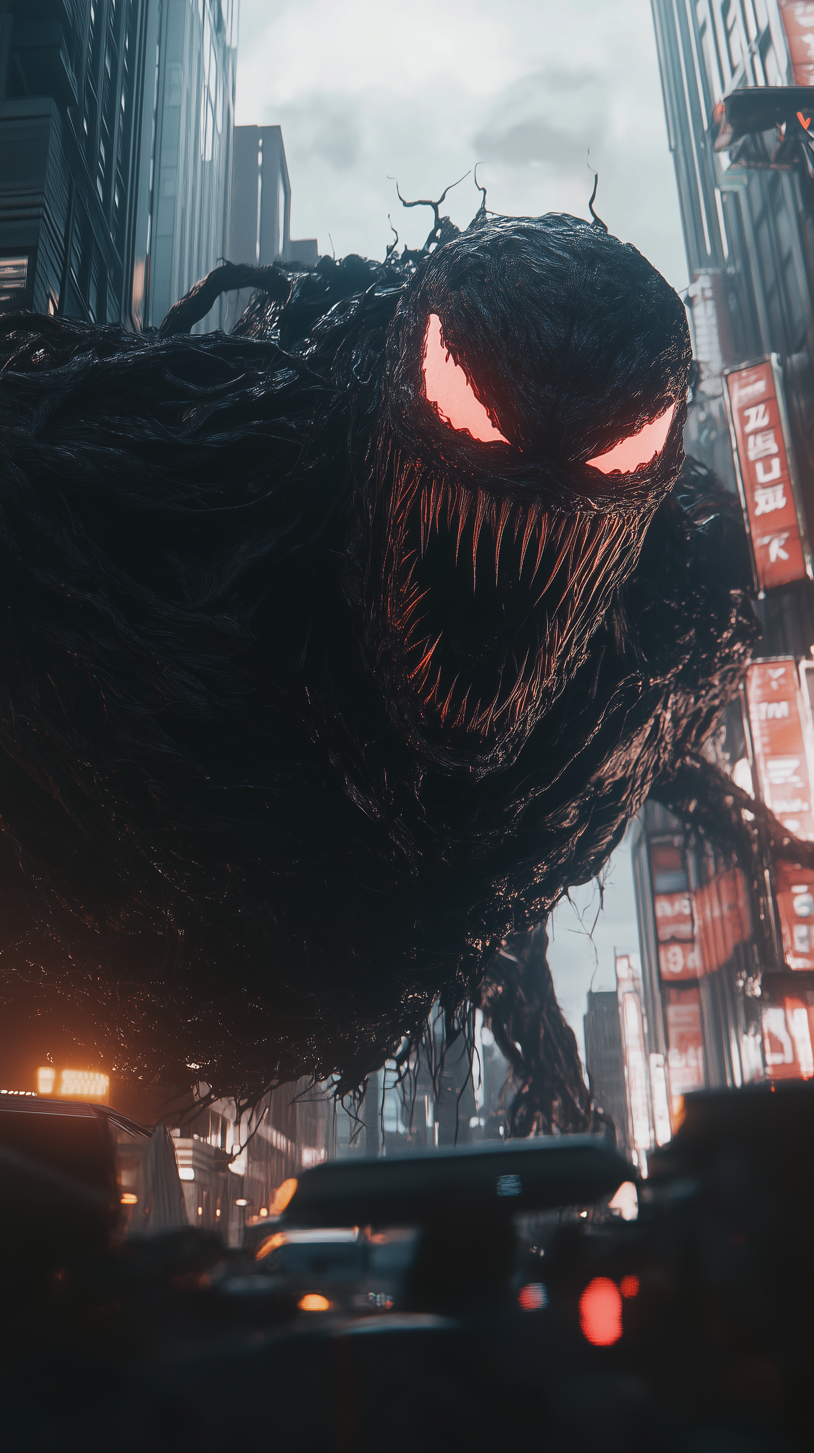The image showcases a striking character merging the rugged texture of a rocky figure with the sleek, ominous appearance of venomous symbiote. Set against an ultra-realistic city background, the character emanates a powerful presence and dynamic energy.