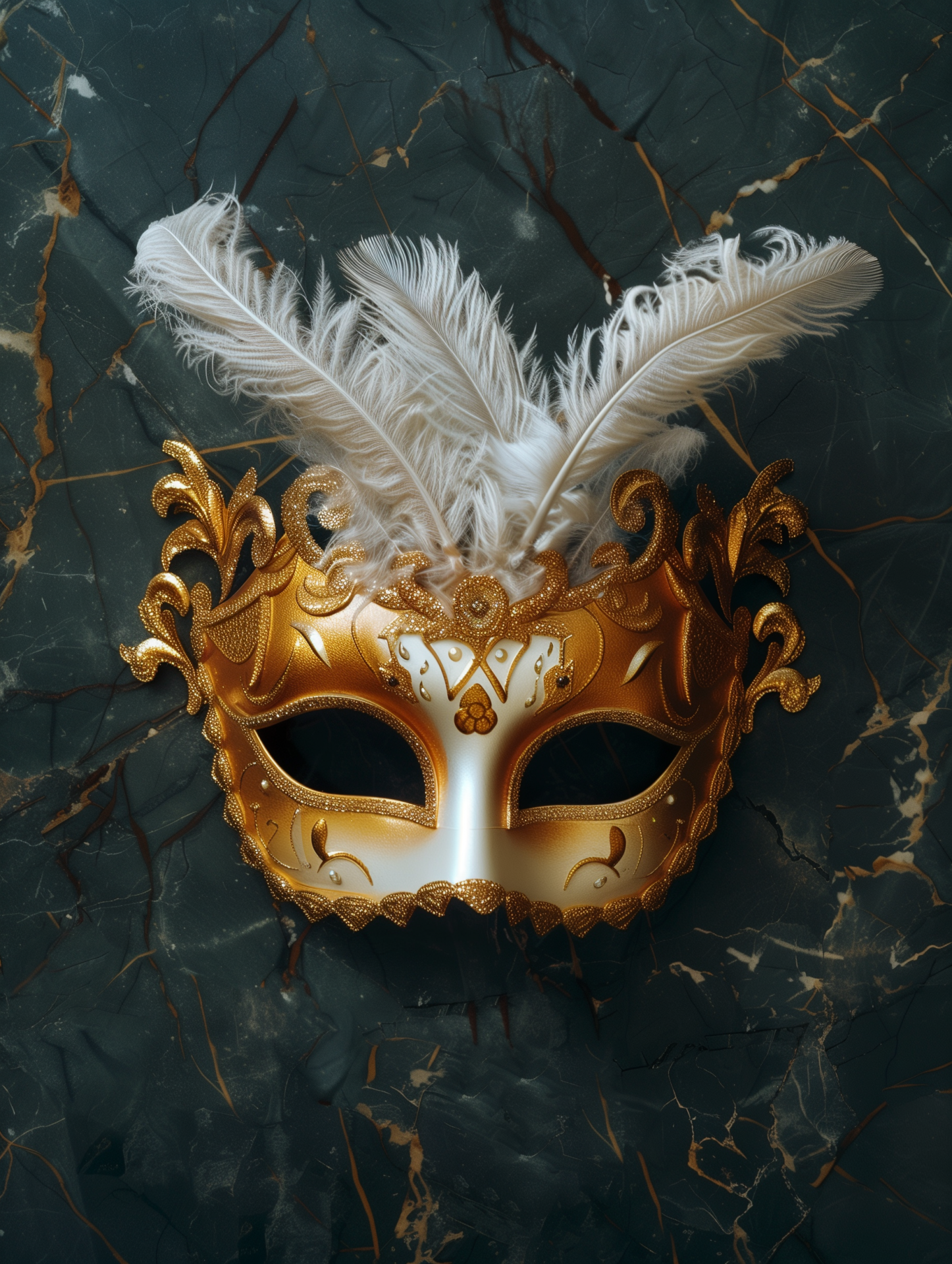 The image showcases a stunning golden Mardi Gras carnival mask resting against a dark marble background. Its elegant details and realistic texture create a captivating and cinematic atmosphere.