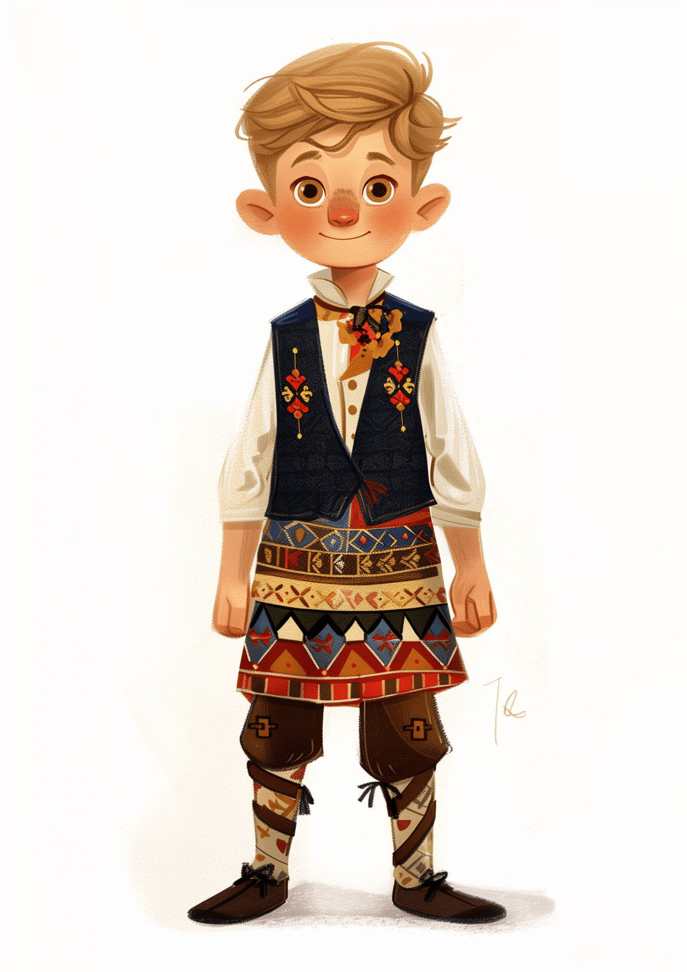 The illustration features a whole body depiction of a little Norwegian boy dressed in traditional costume. The style is vibrant and playful, reminiscent of classic children's book illustrations.