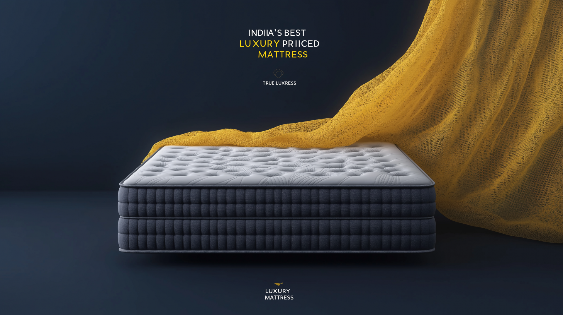 The image features a stylish mattress floating against a deep navy blue gradient backdrop. Surrounding the mattress is a touch of elegant yellow mesh fabric, creating a warm and inviting ambiance.