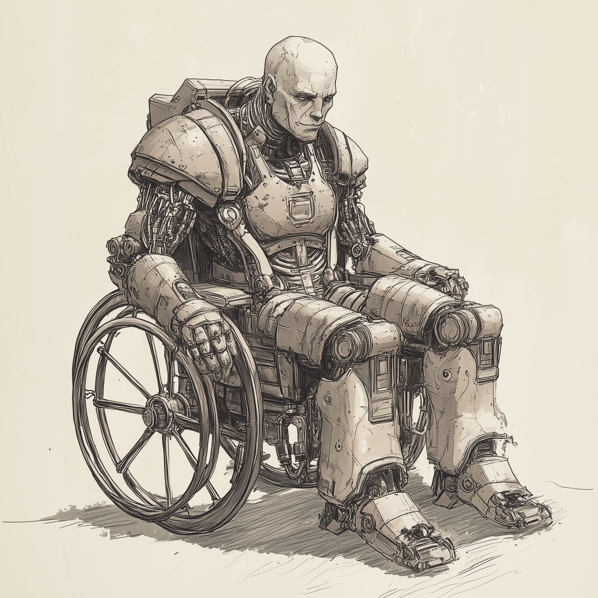 This illustration captures a male warforged character sitting in a mechanized wheelchair. The art style is hand-drawn, showcasing intricate details and a unique blend of fantasy and machinery.