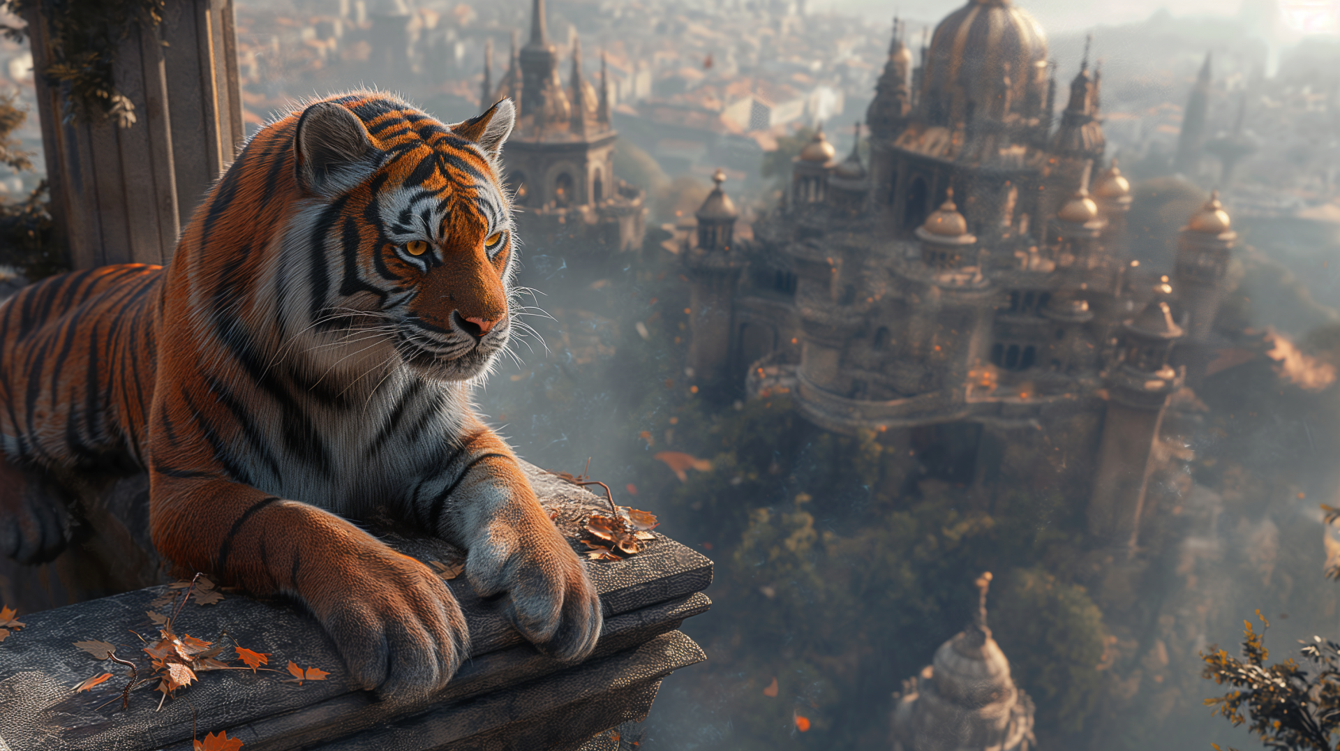 This illustration depicts a whimsical scene set in a medieval castle, featuring a frog and a little tiger in a detailed, vibrant style. The high-resolution artwork brings out the intricate textures and colors, evoking a playful yet enchanting atmosphere.