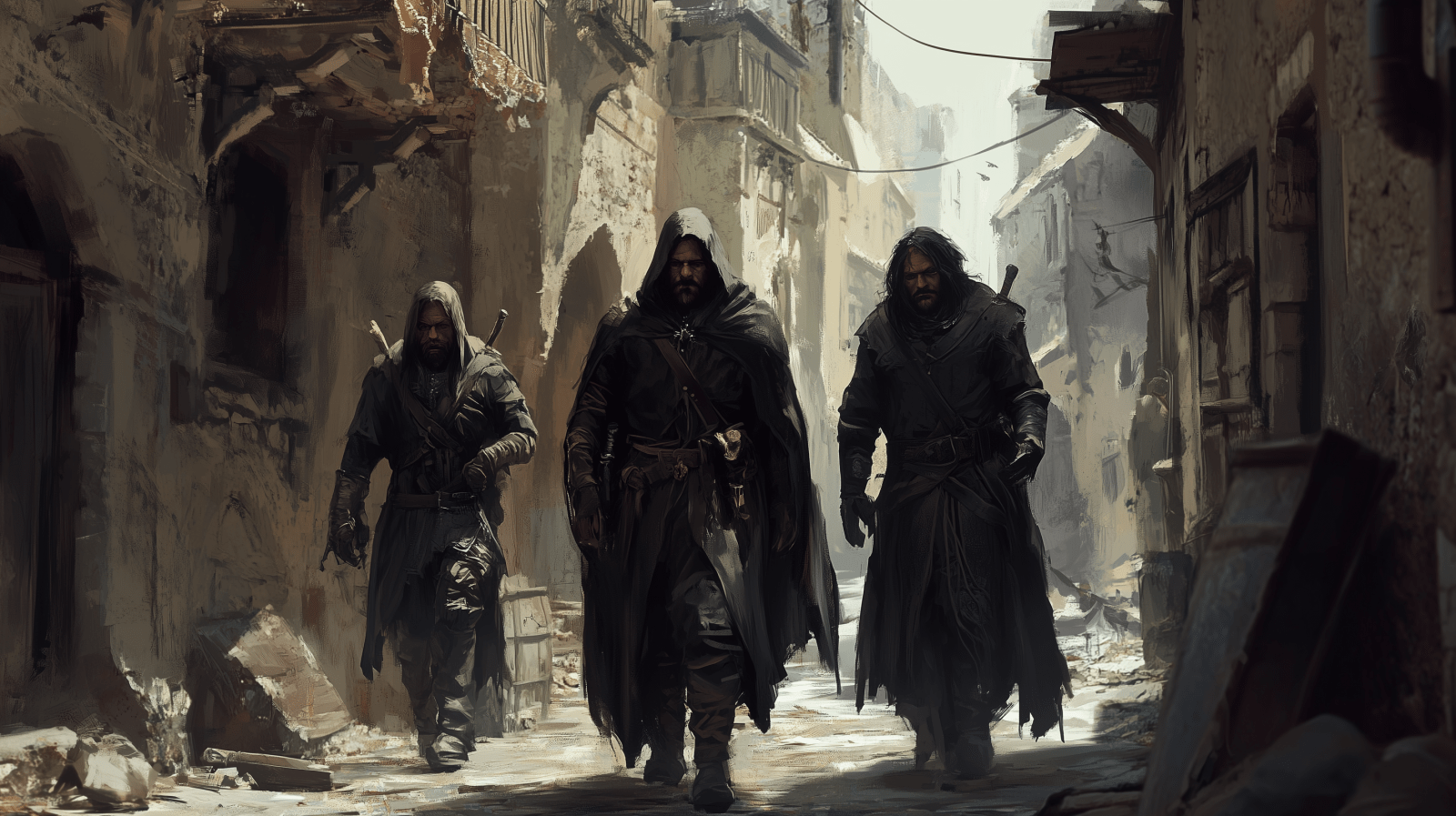 The image depicts a tense scene in a dimly lit alley of a medieval fantasy city. Three rugged thugs are gathered, with one stepping forward assertively, showcasing a blend of menace and authority.