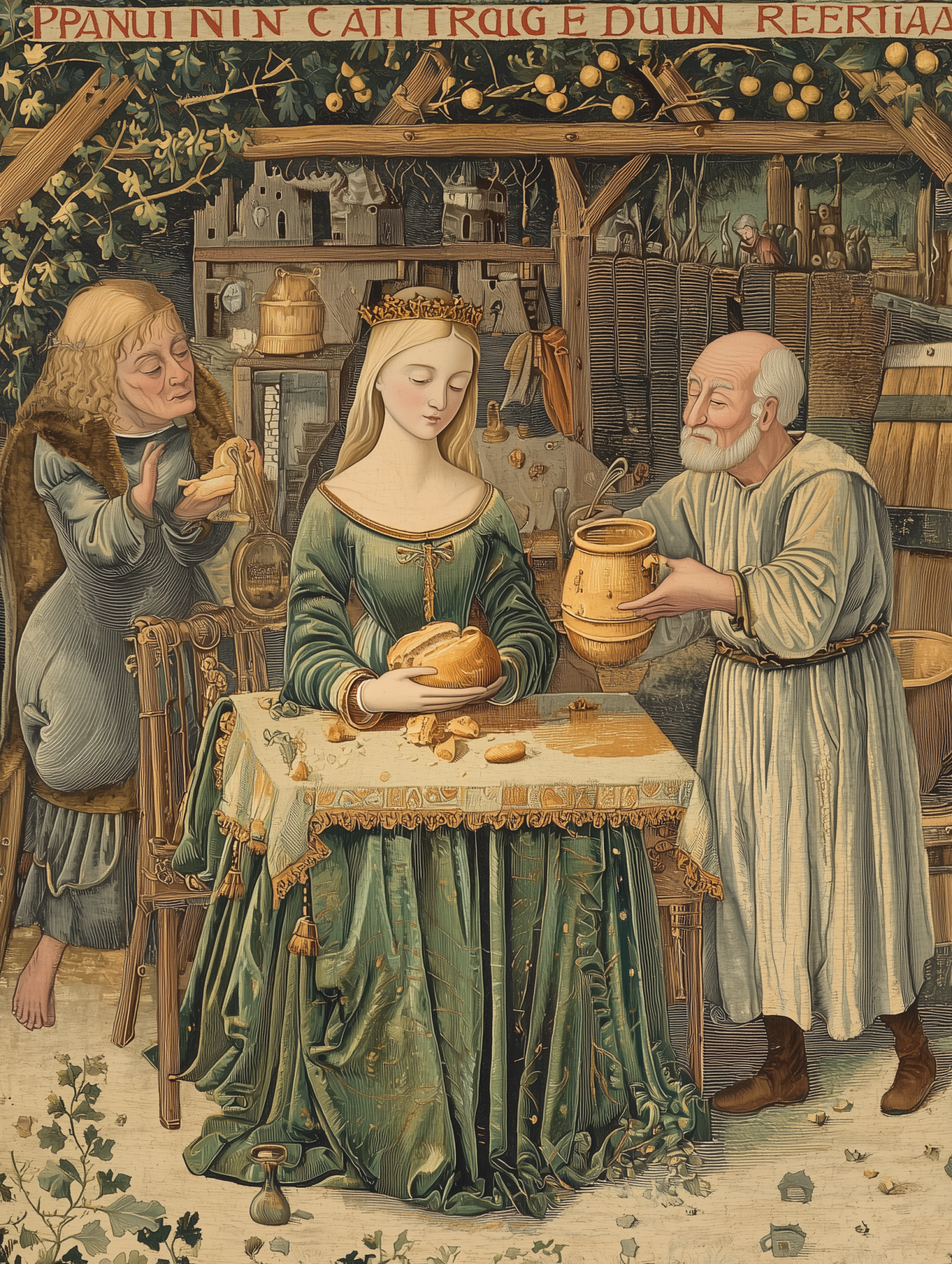 This medieval tapestry showcases a noblewoman in intricate detail, capturing the elegance of the 15th century. The vibrant colors and ornate designs evoke a sense of historical grandeur and artistry.