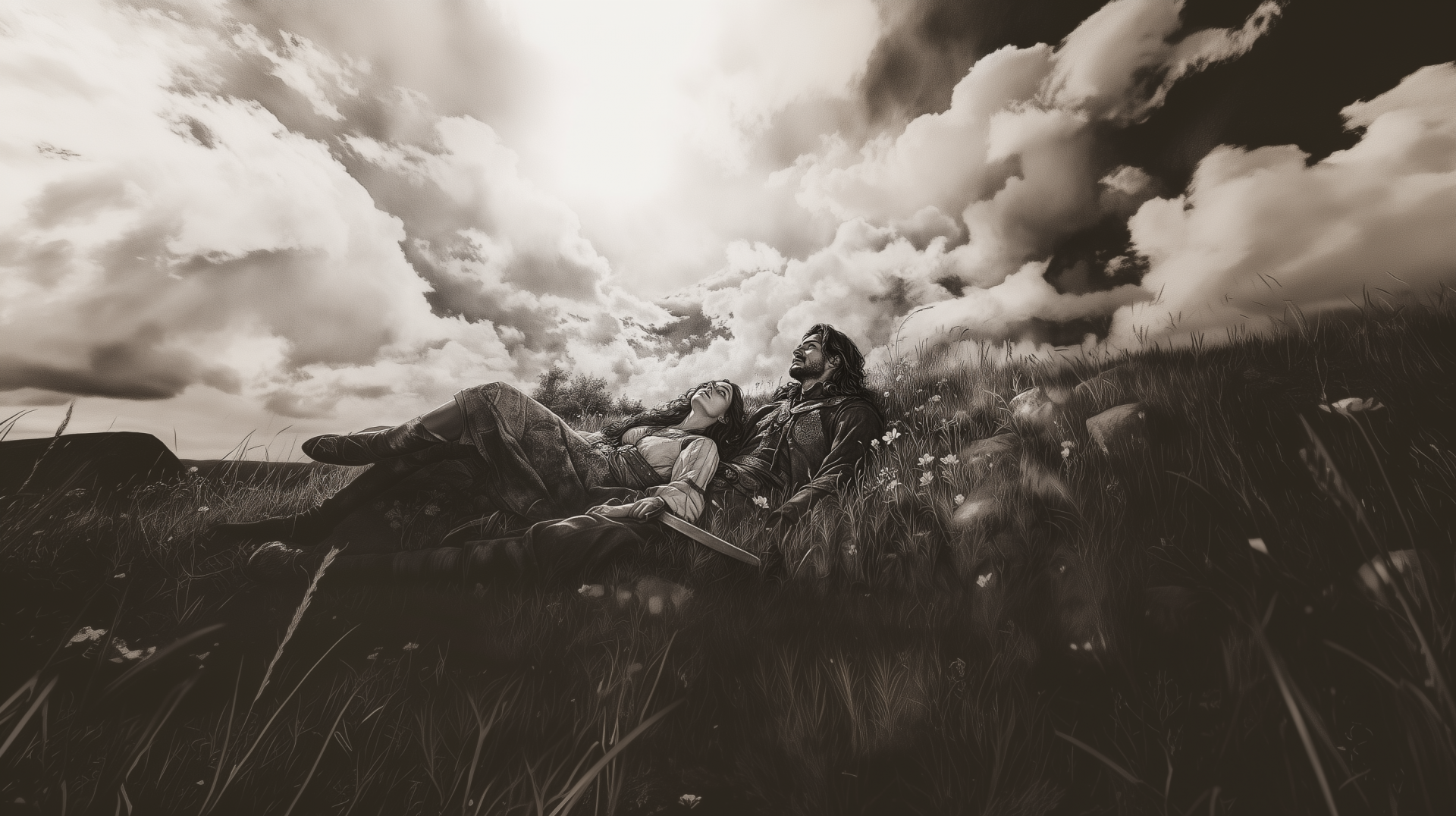 The image features a charcoal drawing depicting a medieval plowman and a peasant woman lying on the grass, gazing up at the clouds. The sunlit scene evokes a sense of tranquility and simplicity, capturing the essence of pastoral life in a medieval setting.