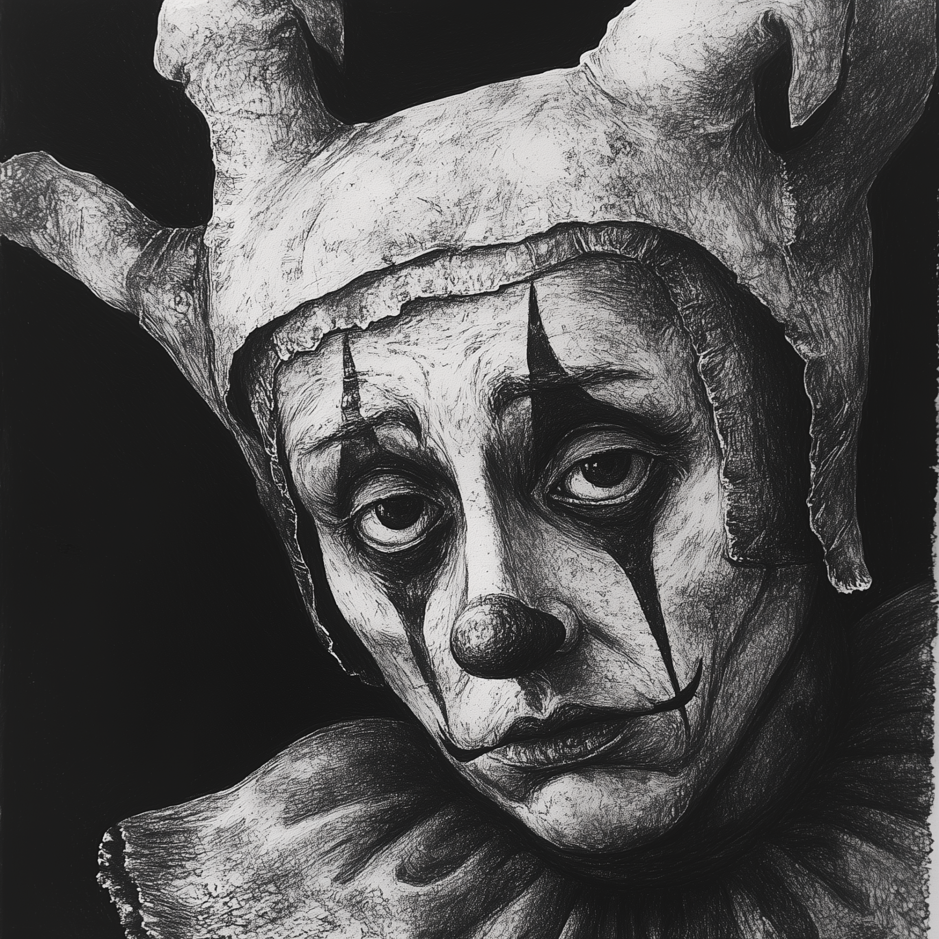 This illustration captures the somber expression of a medieval jester, with a slightly open mouth reflecting sorrow. The black and white pencil drawing evokes a dark and moody atmosphere, emphasizing the jester's melancholic demeanor.