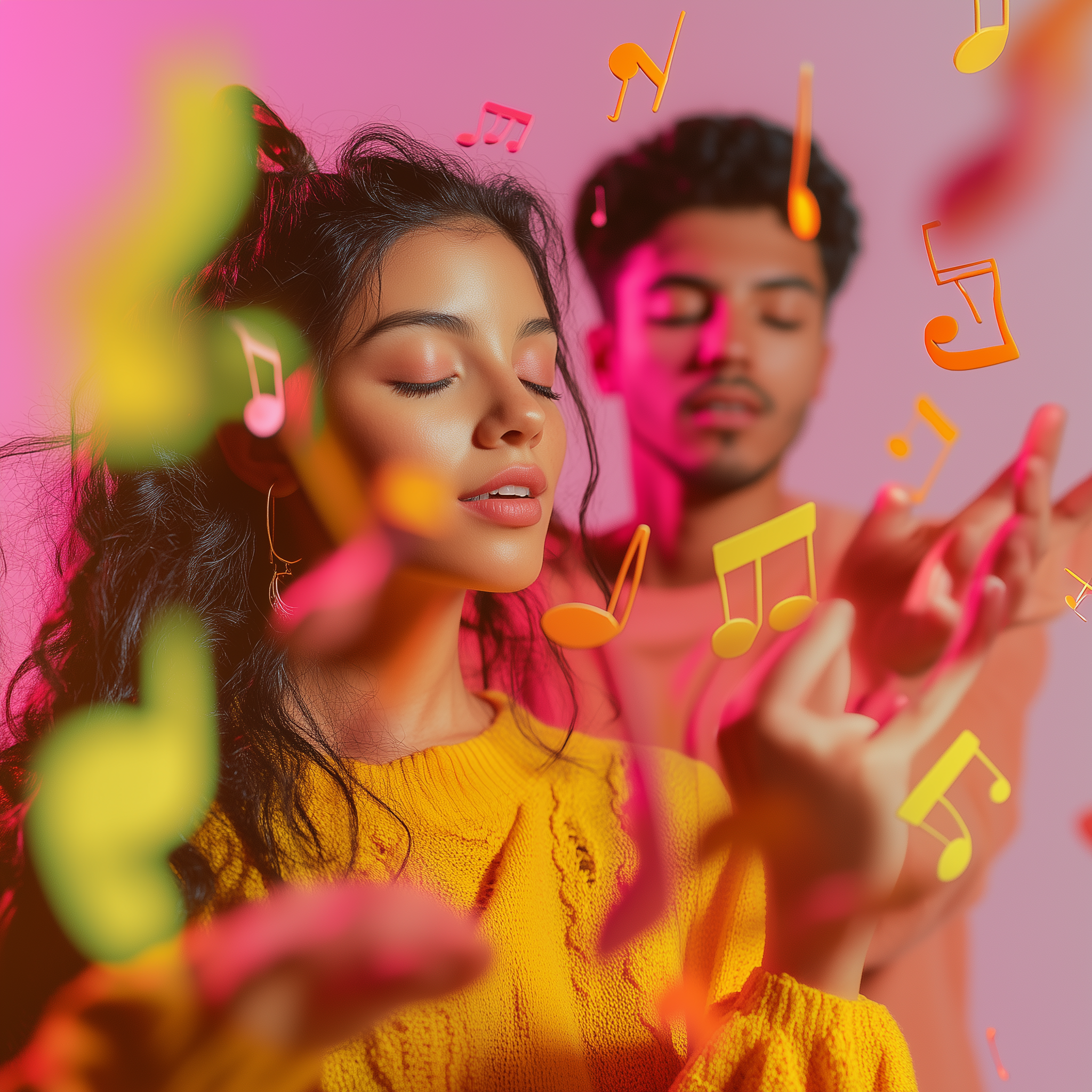 A young latina woman is engaged with vibrant 3D musical notes, which seem to float in the air around her. Behind her, a young man observes with a soft focus, creating an enchanting and dreamy atmosphere.