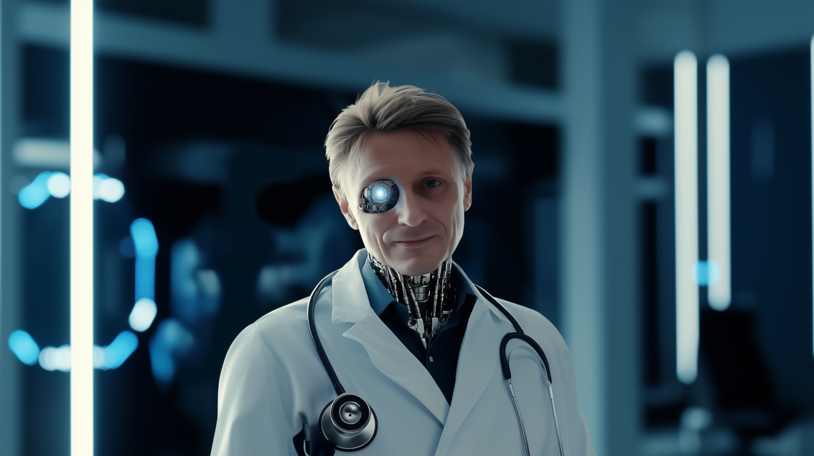 This image showcases a striking portrait of a robot with a human-like face, dressed in a doctor's coat. The background features a futuristic technological environment that enhances the overall feel of innovation and science.