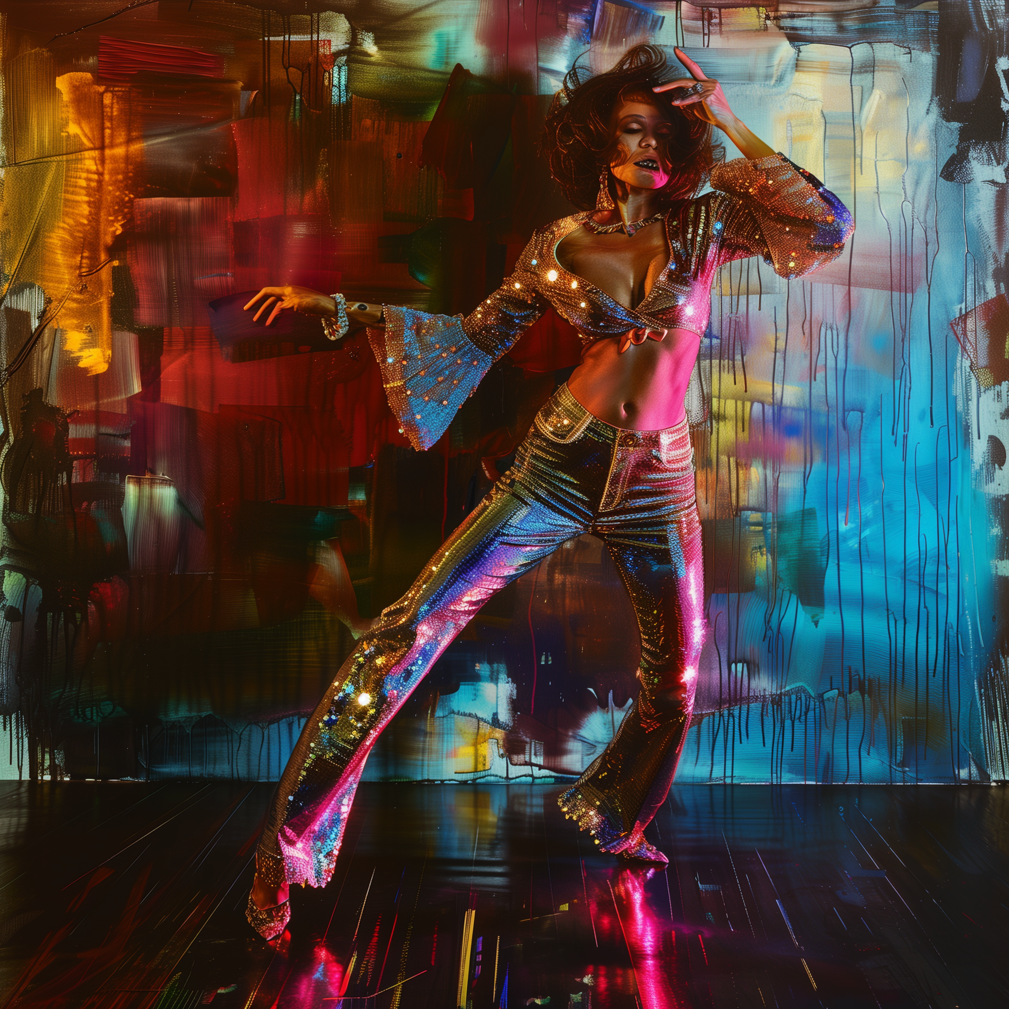An energetic and vibrant disco dancer in her 50s, captured in a dynamic full body shot, exuding retro glamour and joy.