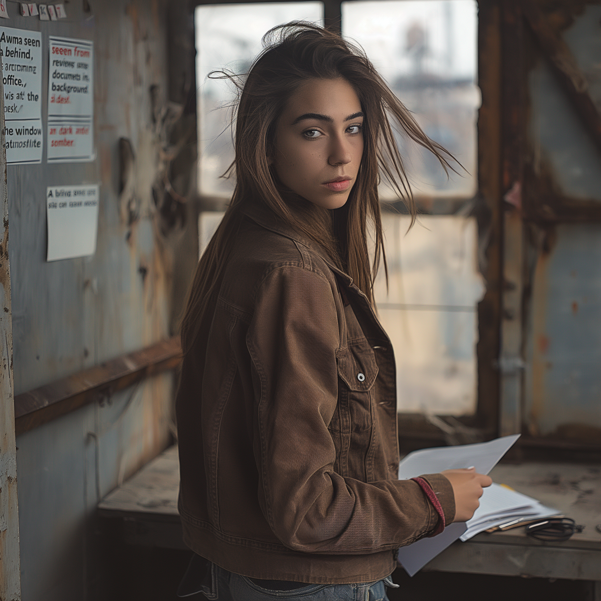 The image captures a woman viewed from behind, as she examines documents in a rustic office setting. The dark and somber atmosphere is highlighted by the window revealing an industrial site outside.