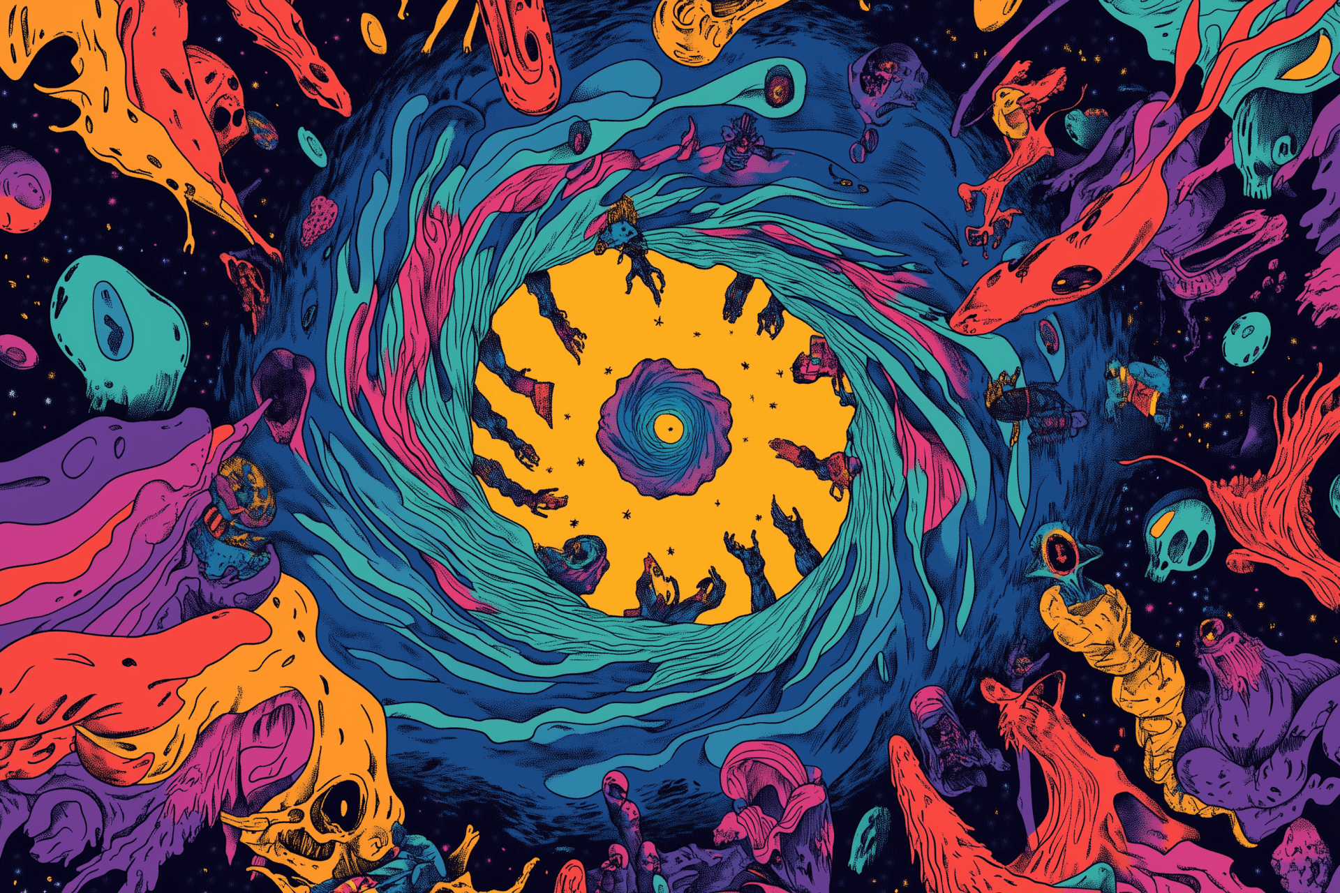 The image depicts a vivid and psychedelic illustration of a spinning vortex symbolizing time reversal. Surrounding the vortex are a multitude of humans, animals, and fantasy creatures engaged in card play amidst vibrant colors and elaborate details.