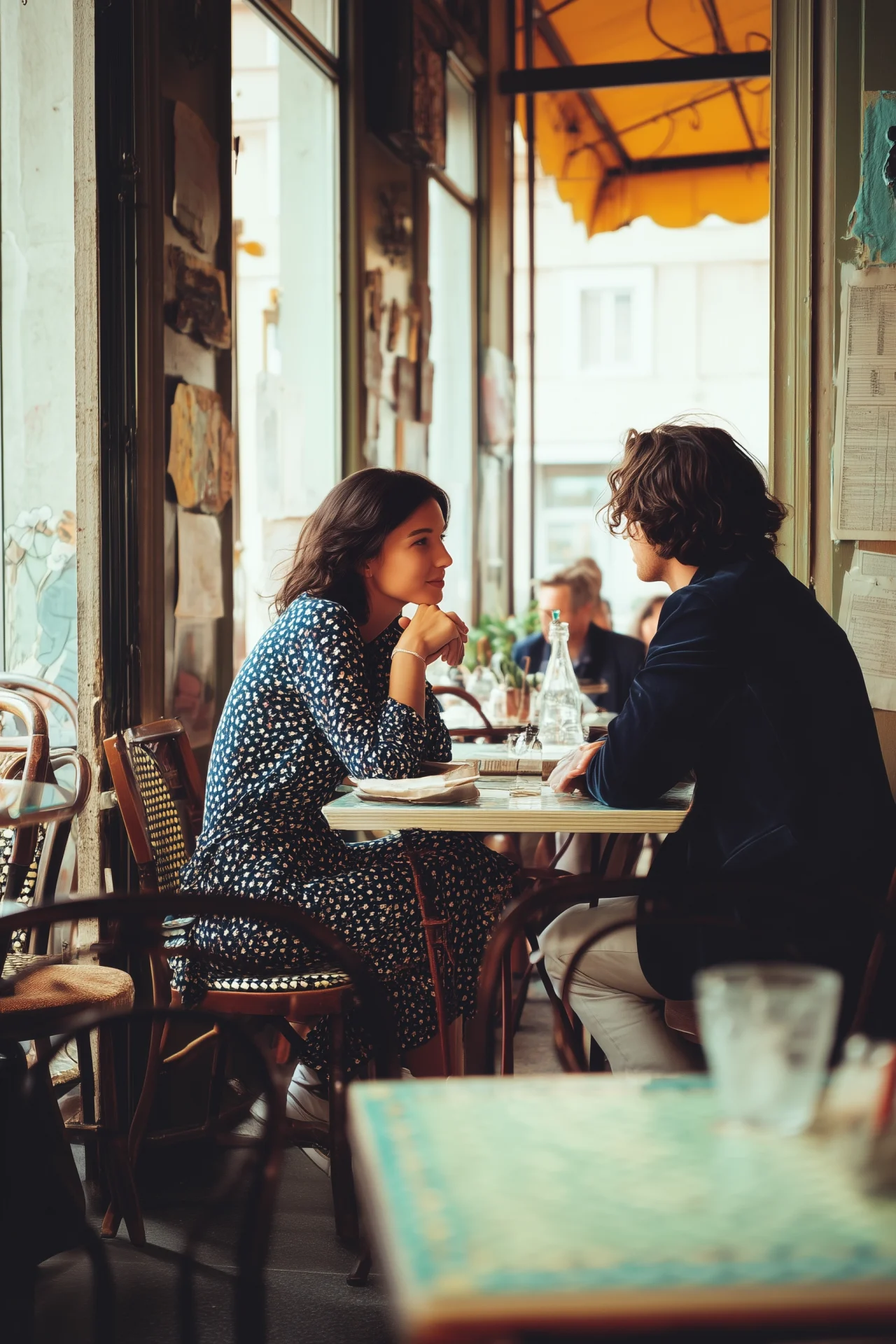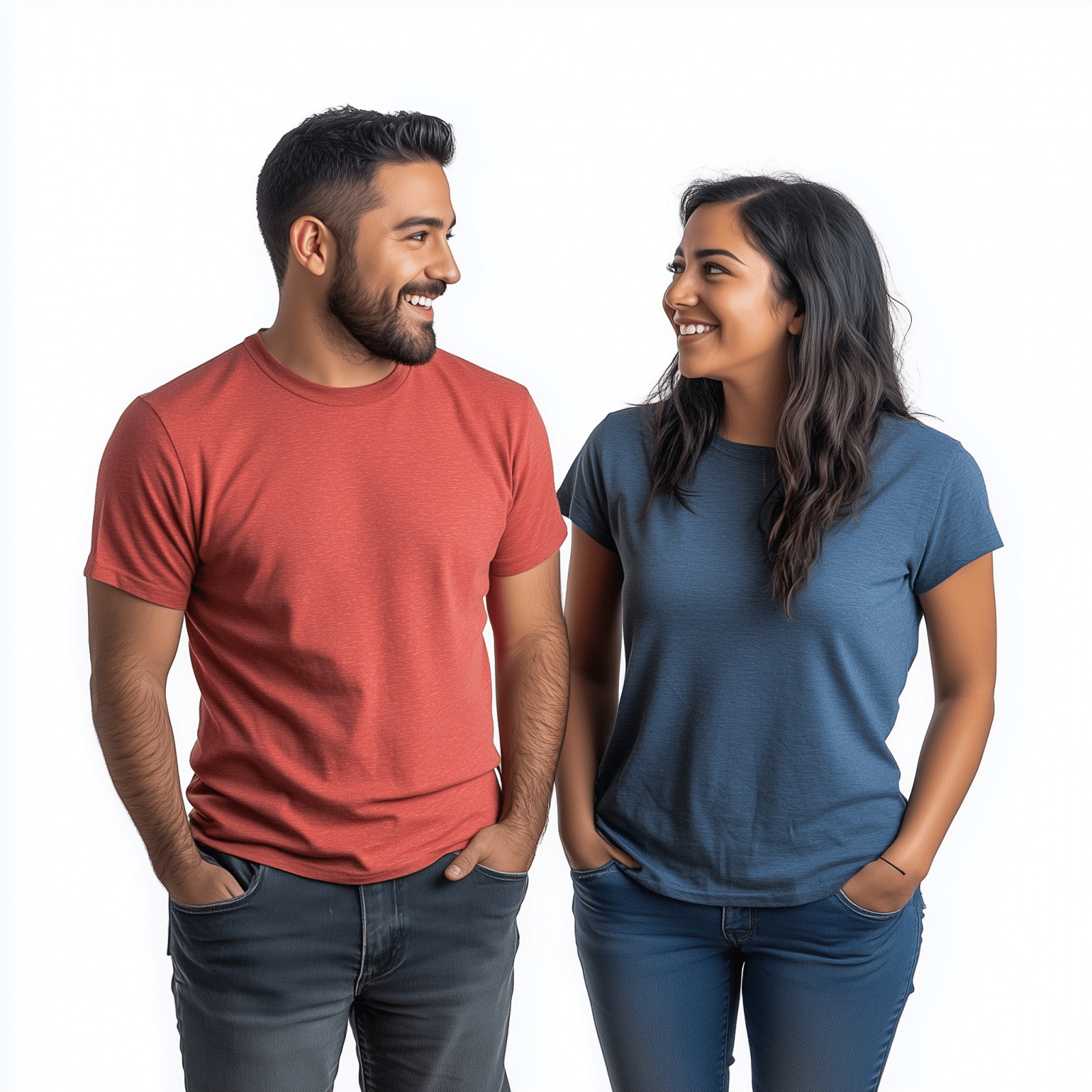 A realistic photograph capturing a Hispanic man and a woman standing side by side, both wearing casual t-shirts. They are attentively listening to a conversation, sharing a moment filled with smiles and connection.