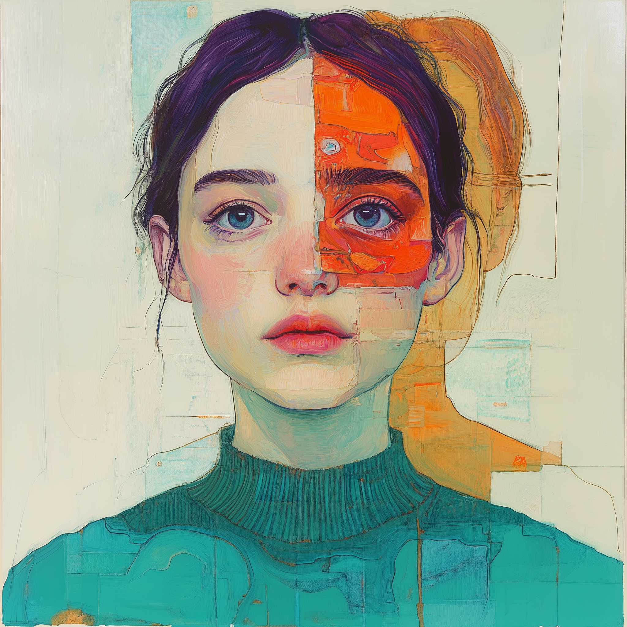 This illustration portrays a young woman making direct eye contact, conveying a deep sense of emotion. Her expression hints at anxiety, while a translucent version of herself looms behind, creating an ethereal atmosphere with teal and coral tones.